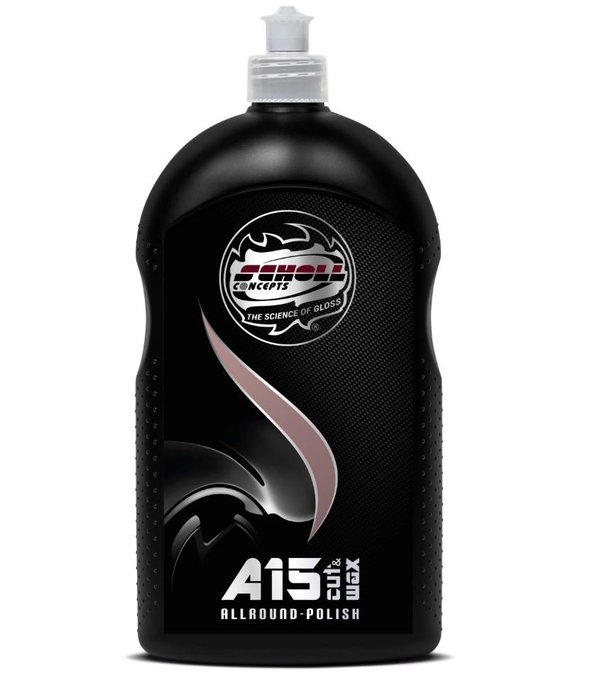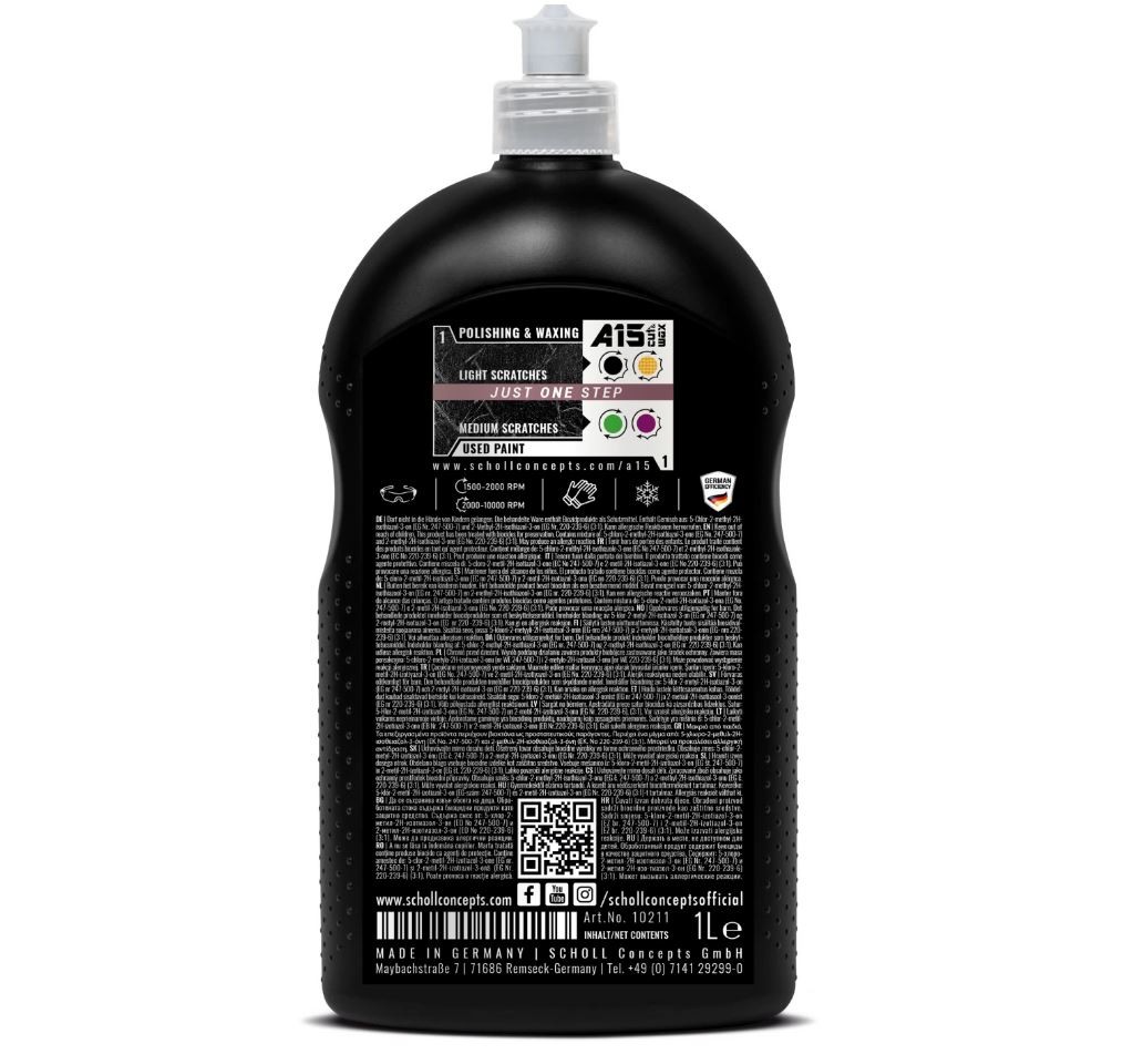 Edinstvena i univerzalna ednostepenna polirashta pasta za bŭrzha i lesna podgotovka na izpolzvan lak. Abraktivna pasta na baza aluminiev oksid vŭv vŭprose na sekundi premakhva nadraскvaniya i obrabotva silno izpostaveni povŭrkhnosti. Sintetichni i prirodni vosuchni sustavi zashtityavat poliranite povŭrkhnosti i ostavyat blestyasht i naturalen blyg po mesetsi. A15 mozhe da se izpolzva s vsichki polirashti pady SCHOLL. Za silno izpostaveni ili silno nadraскani povŭrkhnosti preporŭchvame abraziven polirasht disk Premium TopWool. Za prekhodni nedokŭlnosti na laka izpolzvaite lila polirasht disk s otvoreni pori. Za da poluchite perfekten kraen povŭrkhnost, preporŭchvame da izpolzvate extra mek cheren pad SOFTouch Waffle Pad.