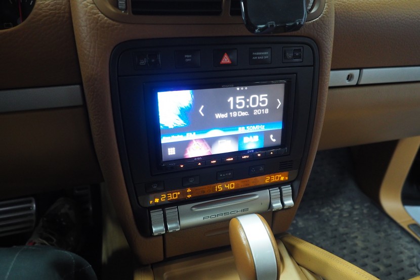 В автомобила Porsche Cayenne заменихме заводското главно устройство с 2DIN мултимедийно авторaдио Kenwood с тъч дисплей, bluetooth handsfree, DAB тунер, Apple CarPlay и множество други модерни функции. Успяхме да активираме и оригиналното управление от волана за новото авторaдио благодарение на подходящ адаптер. Възпроизвеждането на мултимедия за пътниците на задните седалки вече се осигурява от монитор на облегалката, оборудван с USB вход. Инсталирахме и камера за паркиране, която предава изображението на дисплея на Kenwood радио-то.