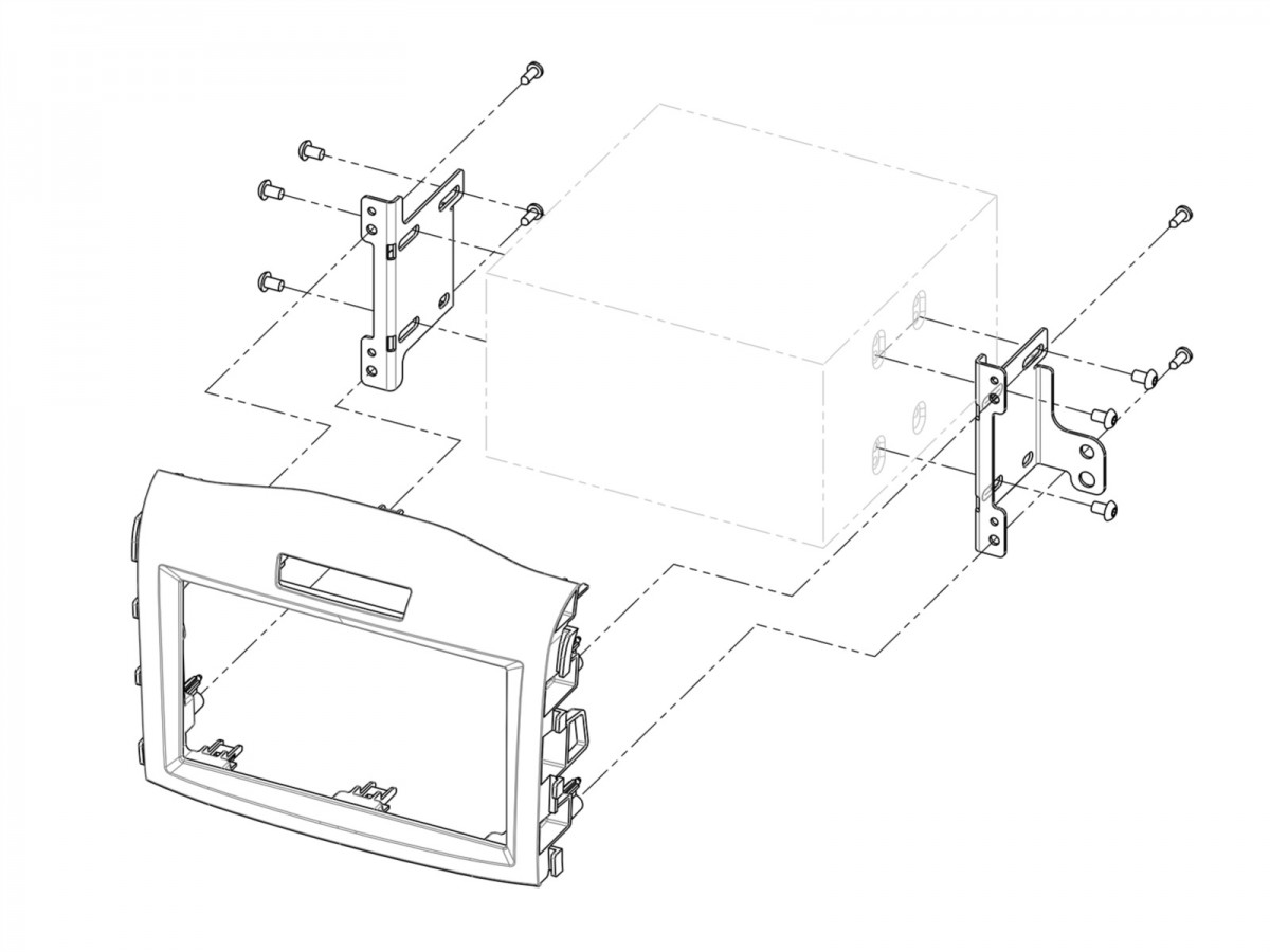 - Опаковката съдържа: пластмасов 2DIN адаптер, 2 бр. дистанционни подложки, странични метални скоби за радиото, винтове и инструкция за монтаж.