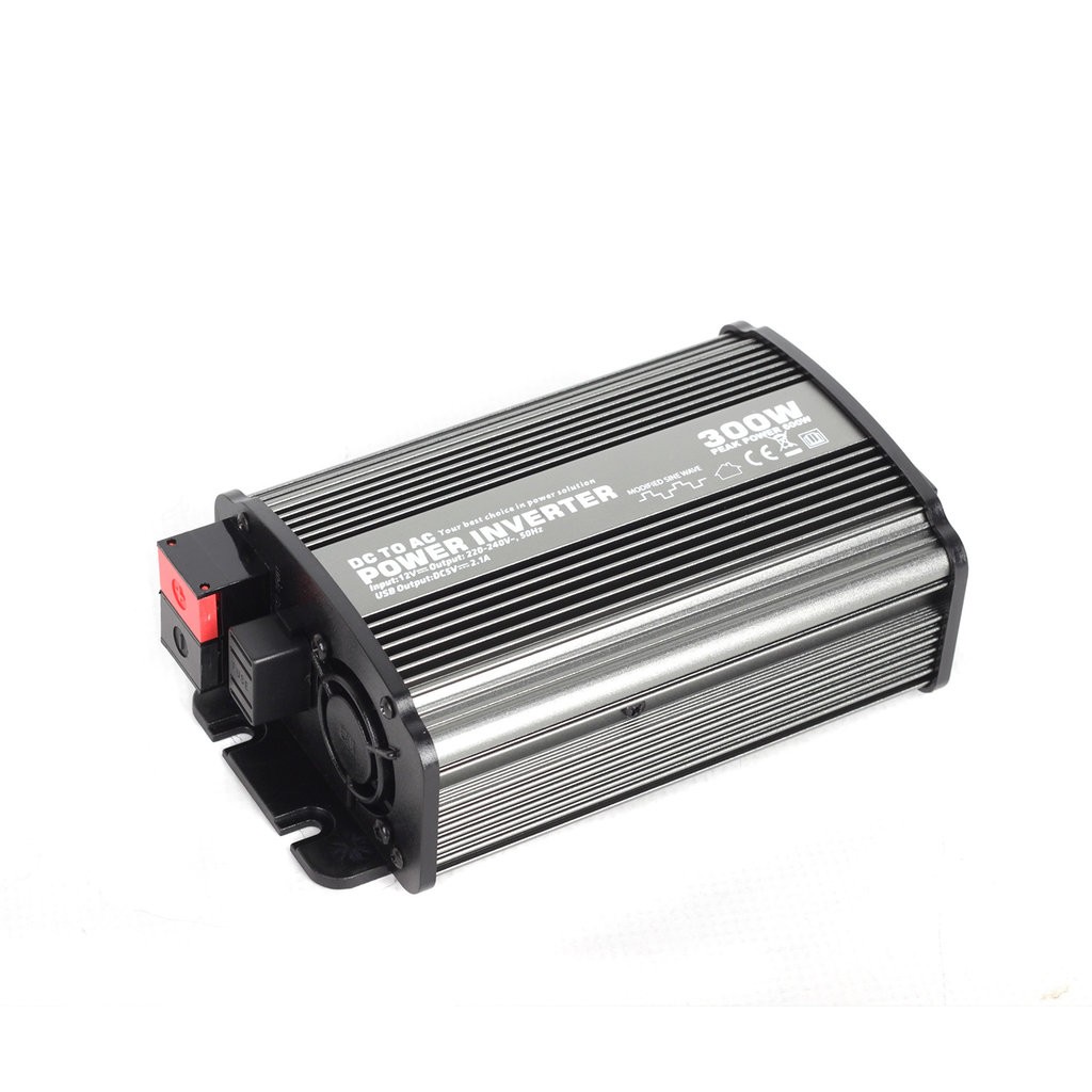 Преобразувател с мощност 300W е подходящ за превозни средства с бордово напрежение 12V (фургони и леки автомобили), за захранване на малки електроуреди 230V. Изходният ток е под формата на модифицирана синусоида (правоъгълен сигнал) с честота 50Hz/230V, оборудван е с USB изход за зареждане на USB устройства (MP3 плейъри и др.).