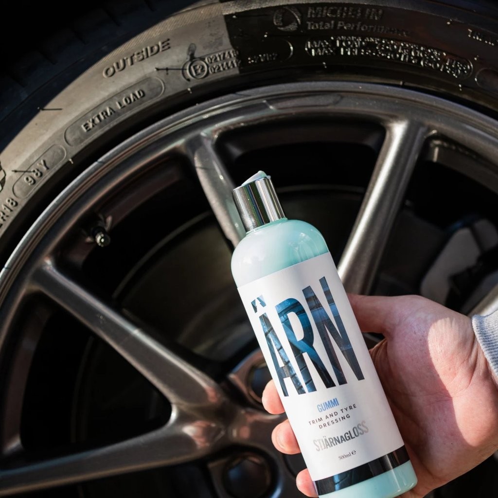 Stjärnagloss Gummi е универсален препарат с перфектна консистенция за обработка на гуми, всички екстериорни пластмаси и гумени части на автомобила. Гумите и пластмасите потъмняват, придобиват блясък и естествена, немазна повърхност. Подходящ за гладки, структурирани, стари и нови пластмаси, но внимавайте - винаги използвайте малко количество, прекомерното дозиране не е добро. Препаратът може дори ефективно да потъмни избелелите екстериорни пластмаси и гумените облицовки.