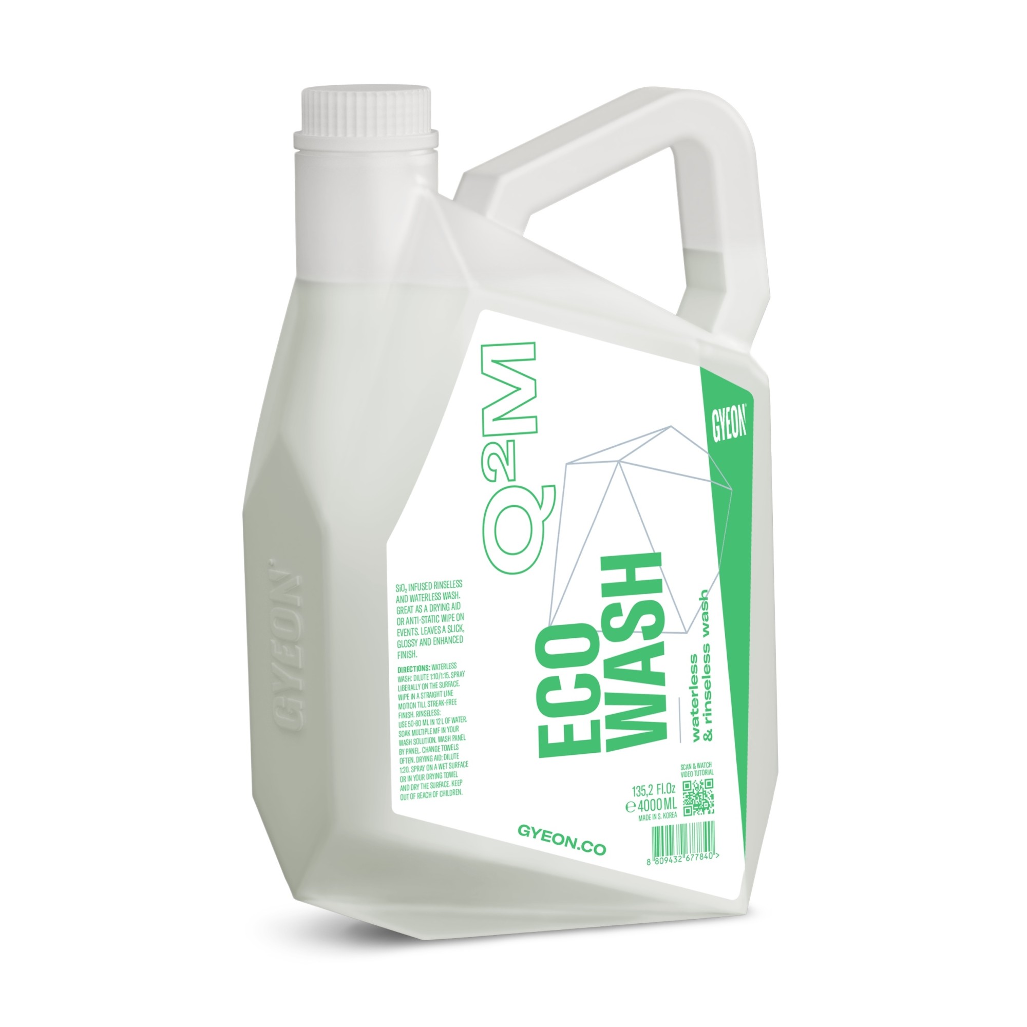 Gyeon Q²M ECOWash ви позволява бързо и безопасно да почистите вашето превозно средство без необходимостта от течаща вода. Не е нужно да мислите за оттичане на вода или къде ще капе почистващият препарат. Този препарат може да се използва по три начина: като препарат за миене без използване на вода, като миене без изплакване и като помощник при подсушаване. Концентрираната формула ви предлага различни възможности за разреждане, така че можете да намерите предпочитаната смес в зависимост от приложението, употребата, климата и личните предпочитания. Q²M ECOWash съдържа добавено SiO2, благодарение на което лакът след почистване е гладък, много блестящ и предоставя водоотблъскващи и самоочистващи свойства. Препаратът е отличен избор за поддръжка на автомобили с керамично покритие в райони, където редовното миене е невъзможно или забранено от закона. Освен това високата му хлъзгавост осигурява по-голяма безопасност при миене. Независимо дали във вашия район предпочитате да миете автомобила с помощта на Q²M ECOWash, Gyeon гарантира, че това може да се прави лесно и, най-важното — безопасно.Основни характеристики
