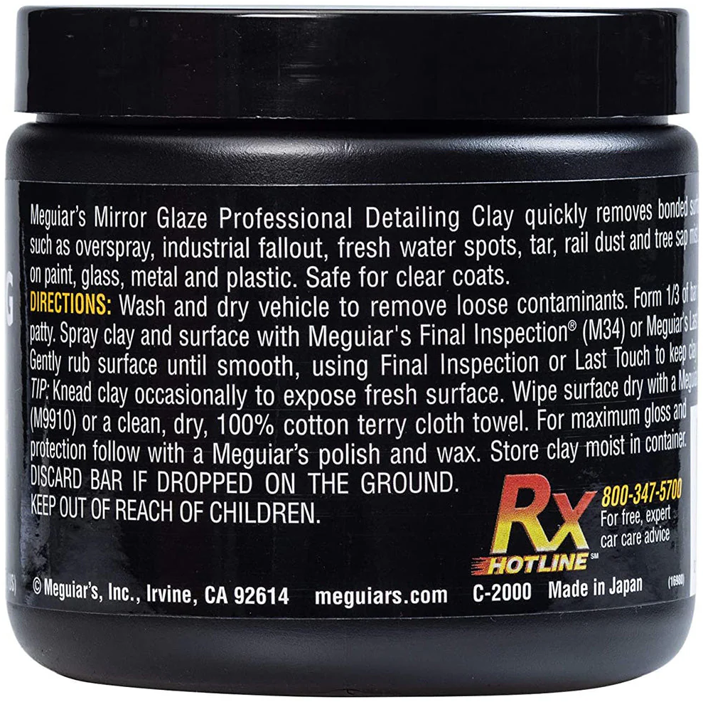 Meguiar’s Mirror Glaze Professional Detailing Clay Mild е професионален clay bar, предназначен за ефективно и безопасно отстраняване на привързани замърсявания като пръски боя, асфалтни точки, смола от дървета, водни петна и железен прах от повърхността на автомобила, включително боя, стъкло, метал и пластмаса. Тази „Mild“ версия е предназначена за редовна поддръжка и много щадяща употреба - перфектно подготвя повърхността за полиранe или защита (восък, сийлант, керамика), като я направи „гладка като стъкло“. Опаковката съдържа 200 г в затваряема кутия, която помага да се запази свежестта ѝ.
