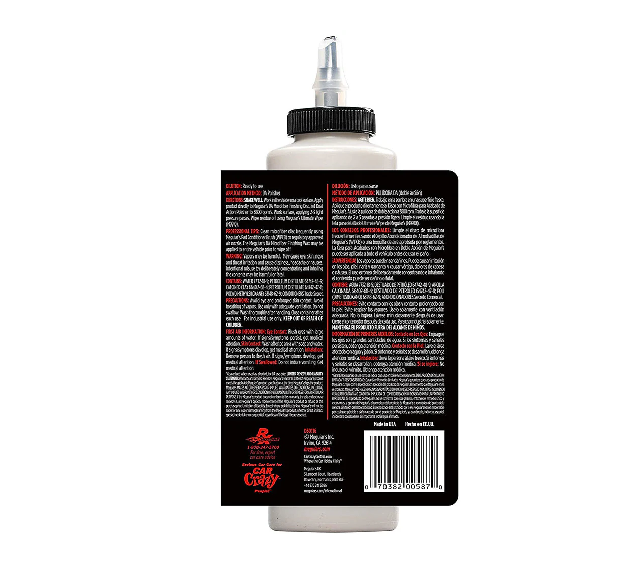 Meguiar’s DA Microfiber Finishing Wax е професионален течен восък и финиширащ препарат, разработен за максимален визуален ефект и защита след корекция на лака с машинна DA система и микрофибърна подложка. Неговата уникална формула съчетава нежни почистващи съставки, защитни полимери, силикони и истинска карнауба, като така осигурява не само значително усилване на блясъка и наситеността на цвета, но и дълготрайна защита. Продуктът е специално създаден за употреба след корекция с DA микрофибърни подложки, предлагайки ниско запрашаване, липса на нежелано „sling“ пръскане и лесно изтриване. Резултатът е повърхност с професионален блясък, гладкост и готовност за последващо восъчно покритие или защитен слой.