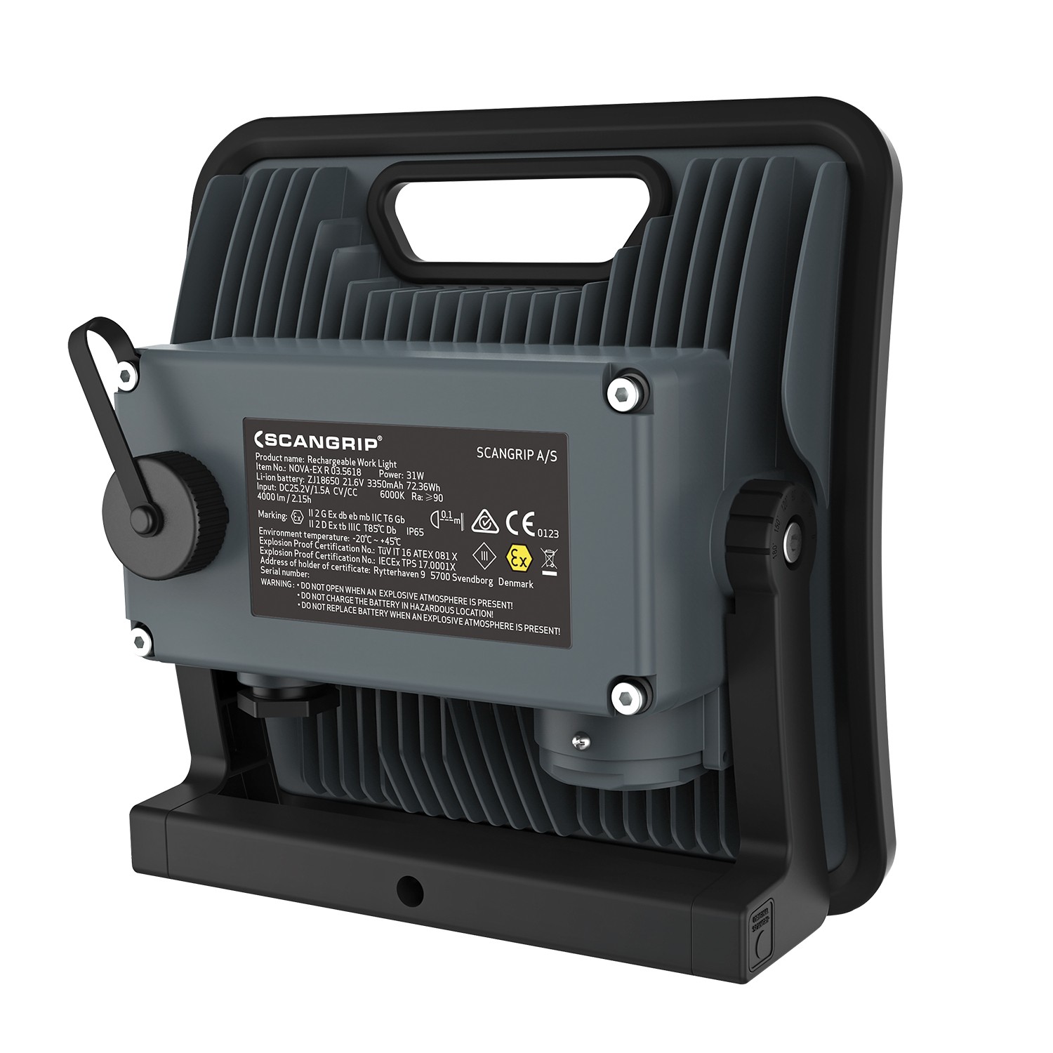 \n\nSCANGRIP NOVA-EX R с модерен светлинен източник COB LED осигурява изключително ярко осветление и изключително висока светлинна мощност 4 000 лумена. Благодарение на здравата конструкция NOVA-EX R е устойчива на експлозии, удари, сурови, влажни и мръсни условия на професионална работна среда и е напълно водоустойчива (IP65). Нивото на CRI (т.нар. индекс на възпроизвеждане на цветовете) се доближава до дневната светлина. Поради това NOVA-EX R осигурява вярно възпроизвеждане на цветовете. Неограничени възможности се постигат особено при поставяне на лампата на статив SCANGRIP TRIPOD EX или SCANGRIP MAGNETIC BRACKET EX, които са одобрени за използване във взривоопасни среди.