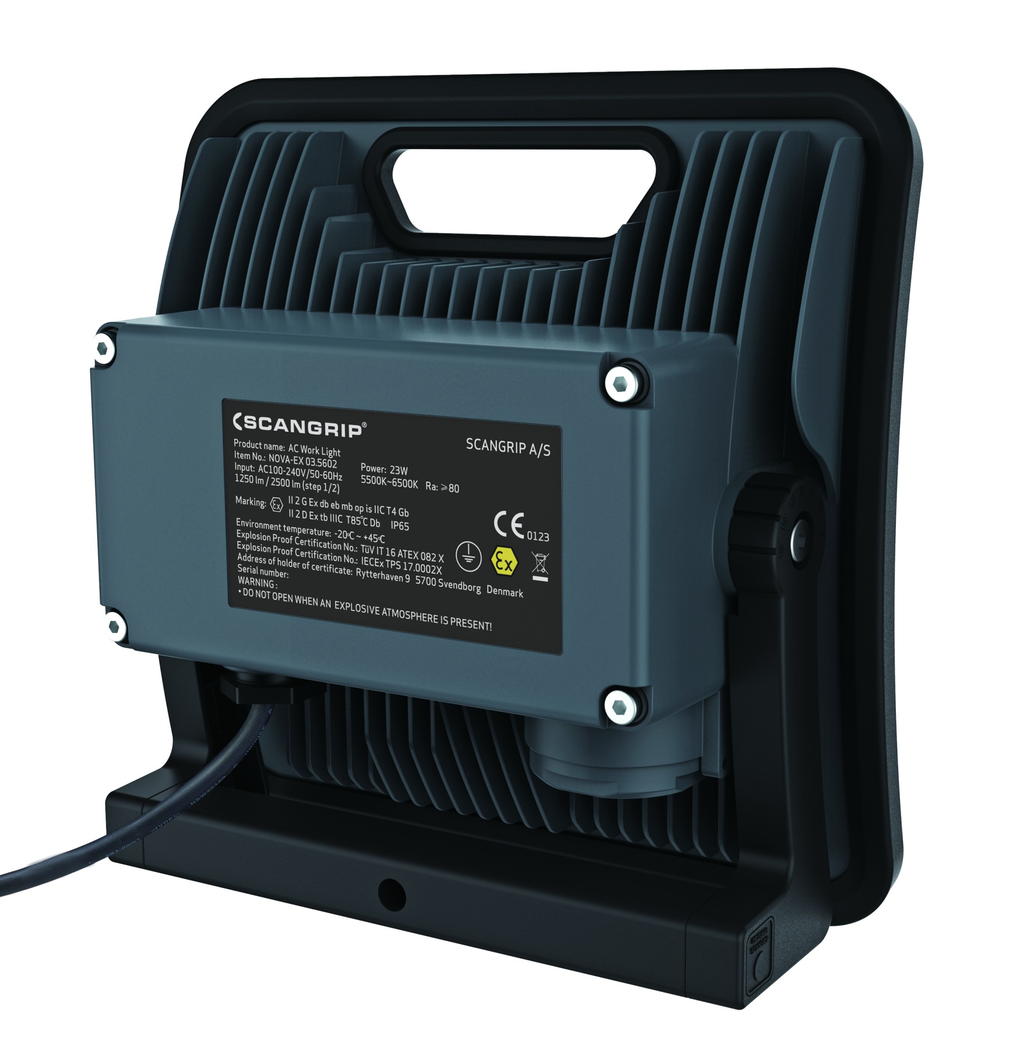 \n\nSCANGRIP NOVA-EX с модерен светлинен източник COB LED осигурява изключително ярко осветление и изключително висока светлинна мощност с напълно равномерно осветяване. Благодарение на здравата конструкция NOVA-EX е устойчива на експлозии, удари, сурови, влажни и мръсни условия на професионалната работна среда и е напълно водоустойчива (IP65). Нивото на CRI (т.нар. индекс на възпроизвеждане на цветовете) се доближава до дневната светлина. Поради това NOVA-EX осигурява вярно възпроизвеждане на цветовете. Доставя се с 10 m кабел, който осигурява постоянен достъп до електричество. Неограничени възможности се постигат особено при поставяне на лампата на статив SCANGRIP TRIPOD EX или SCANGRIP MAGNETIC BRACKET EX, които са одобрени за използване във взривоопасни среди.