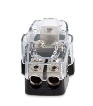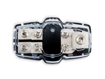 Разпределителен блок за два Mini-ANL предпазителя с един вход до 35 mm² и два изхода до 16 mm². Предпазителите и контактните повърхности на кабелите са защитени с здрав пластмасов капак. Два отвора за закрепване на разпределителния блок са разположени в долната част на корпуса. Размери: 84 x 48 x 35 mm.