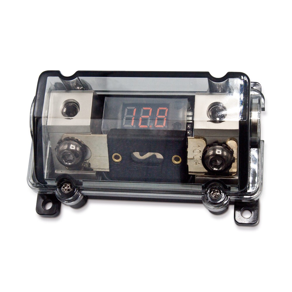 Разпределителен блок за ANL предпазители с вграден волтметър, пригоден за кабели до сечение 35 mm², два редуктора за кабели 16 mm². За безопасно закрепване този държач има четири отвора във външните ъгли. Размери (д x ш x в): 106 x 70 x 42 mm, тегло 280 грама.