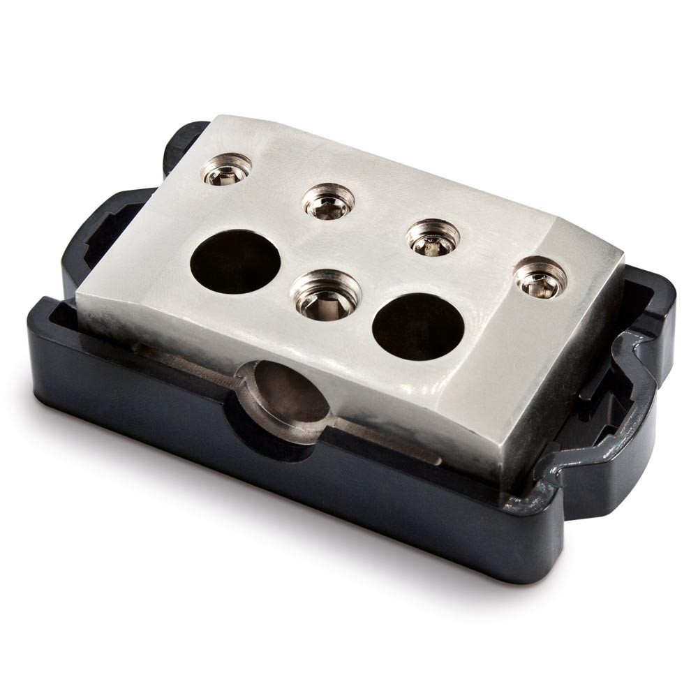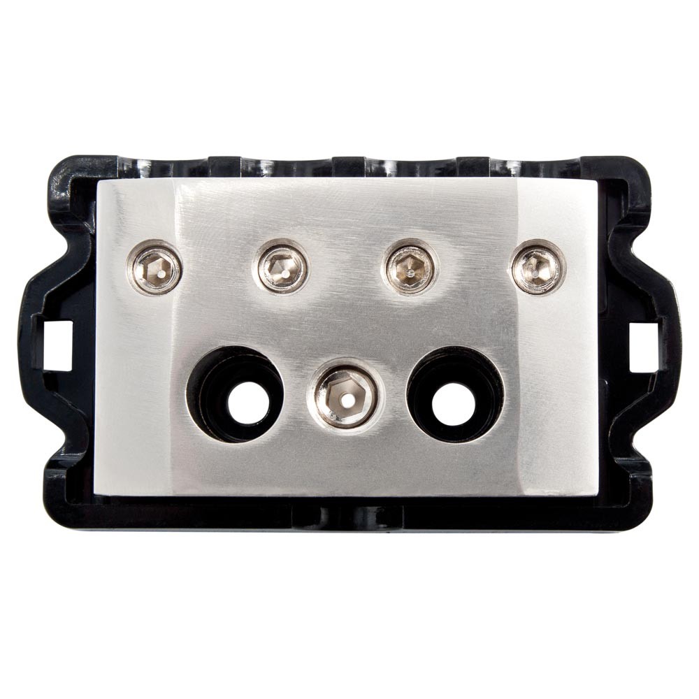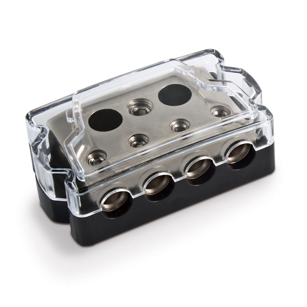 Разпределителен блок с един вход и четири изхода. Масиран разпределителен блок за разделяне на захранващи кабели със здрав пластмасов капак. В пластмасата има два отвора за здраво закрепване.