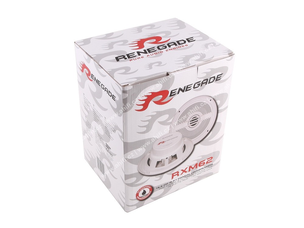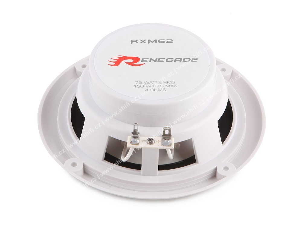 Влагоустойчиви високоговорители Renegade RXM, които предлагат на ниска цена високо качество на звука, здрава изработка и дълготрайност благодарение на солидна конструкция. Високоговорителите Renegade RXM са подходящи за използване на лодки, в бани, в тоалетни на ресторанти, на външни тераси, в градински ресторанти, беседки и др. Устойчиви са на пръски вода и затова кошът е от втвърден пластмасов материал (цвят на коша — елегантно бял — неутрален и ненатрапчив). Вградената високочестотна говорителна единица с mylar мембрана е с диаметър 25 мм. В опаковката ще намерите 2 броя високоговорители.Основни характеристики