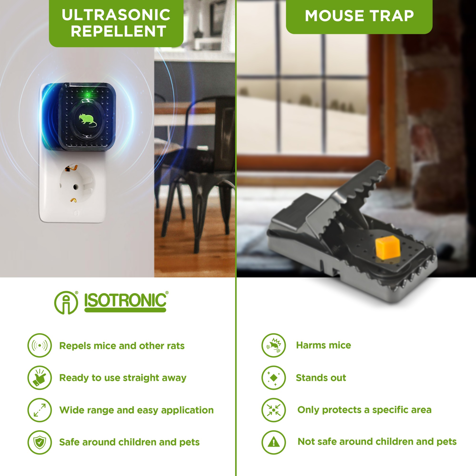 Репелентите Isotronic представляват надеждно и щадящо решение за защита на превозни средства, домове или гаражи от нежелани посетители като куници, мишки, плъхове или други вредители. Тези електронни репеленти използват ултразвукови сигнали или импулсно напрежение, които са неприятни за животните, но напълно безопасни за човека. В асортимента ще намерите компактни модели предназначени за монтаж в моторното отделение, както и универсални уреди за използване в интериора на сгради. Репелентите Isotronic са известни с дълъг живот, ниска консумация и лесен монтаж. Защитете вашето превозно средство или имущество от повреда на кабели или изолация. С марката Isotronic получавате тих, но много ефективен защитник.
