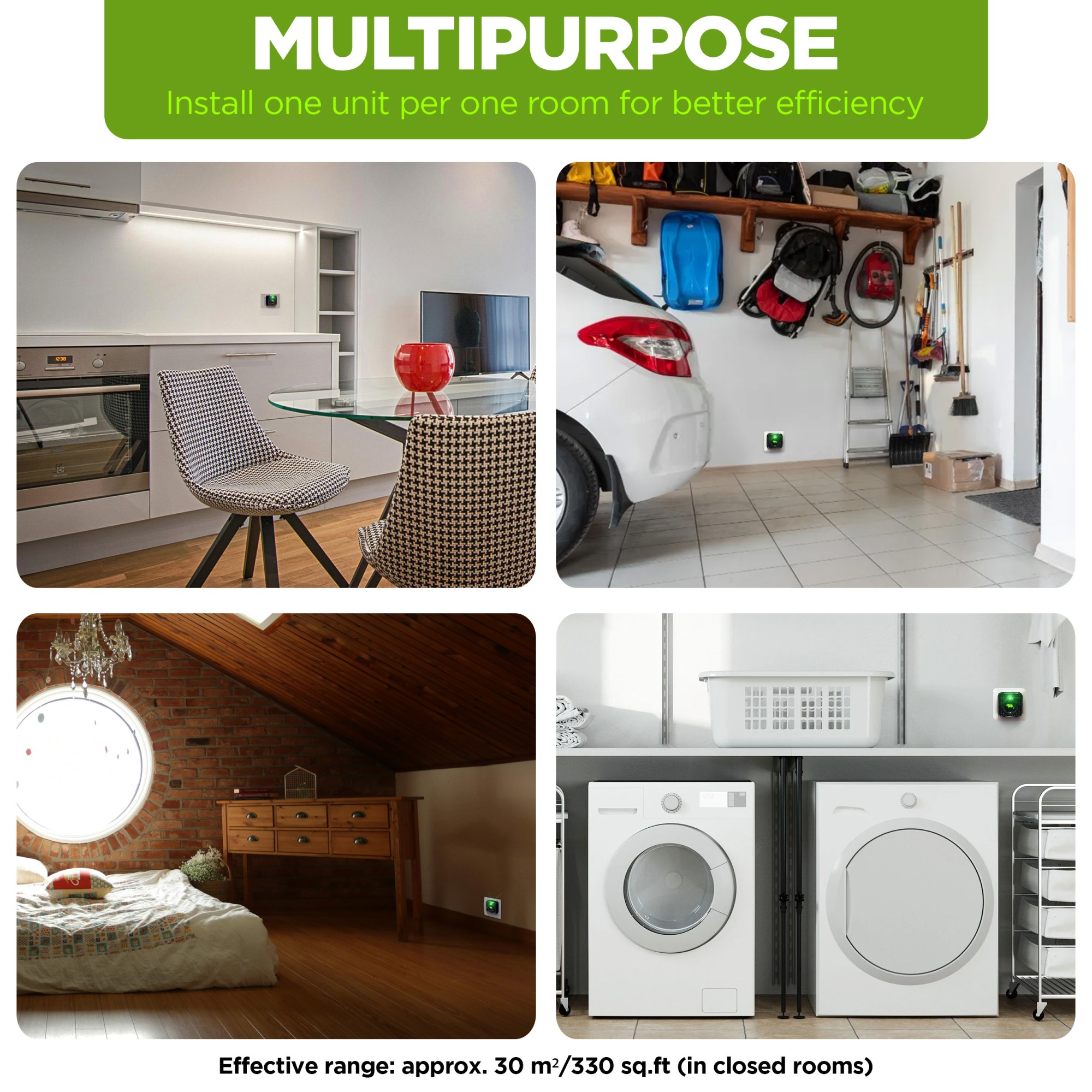 - Област на действие: около 30 m² в затворени помещения.