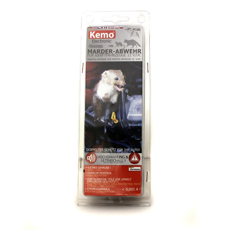 Kemo е немски производител, специализиран в разработката на репеленти срещу куни, мишки и други вредители за използване в автомобили, домове и стопански обекти. Продуктите на тази марка са известни с висока надеждност, прецизна изработка и ефективна технология, която комбинира ултразвук, импулсно напрежение и звукови ефекти за максимален ефект. В асортимента ще намерите репеленти за моторния отсек, както и универсални модели за дома, работилницата и др. Kemo предлага и устойчиви на влага варианти, което осигурява дълъг живот дори в тежки условия. Благодарение на лесния монтаж, ниската консумация и безопасността за хора и животни, репелентите Kemo са идеалното решение за всеки, който търси дълготрайна безхимична защита.| Каталожен номер | M186 |