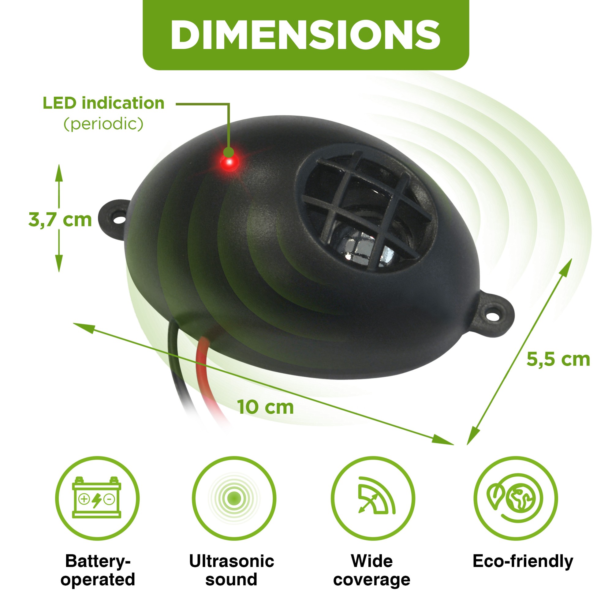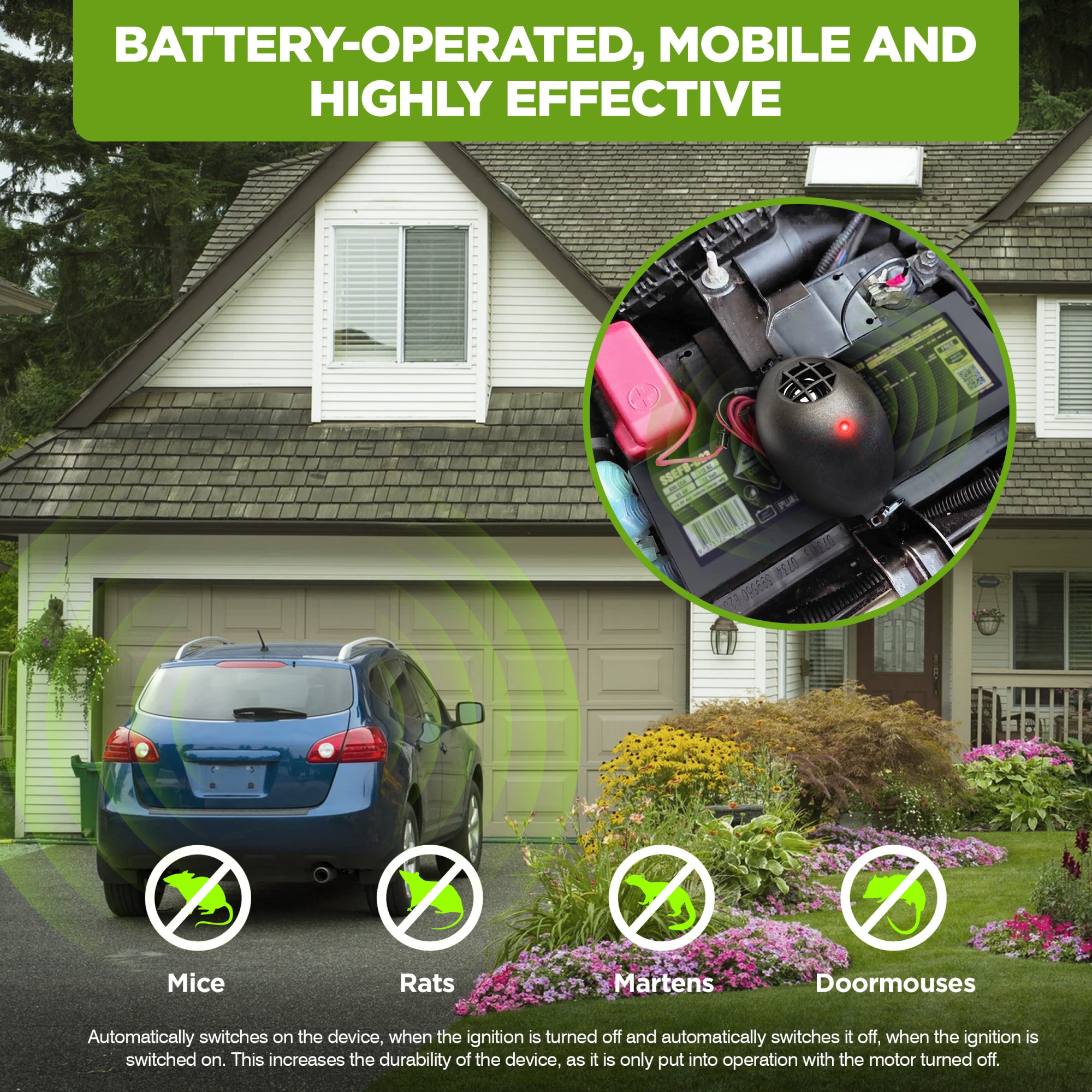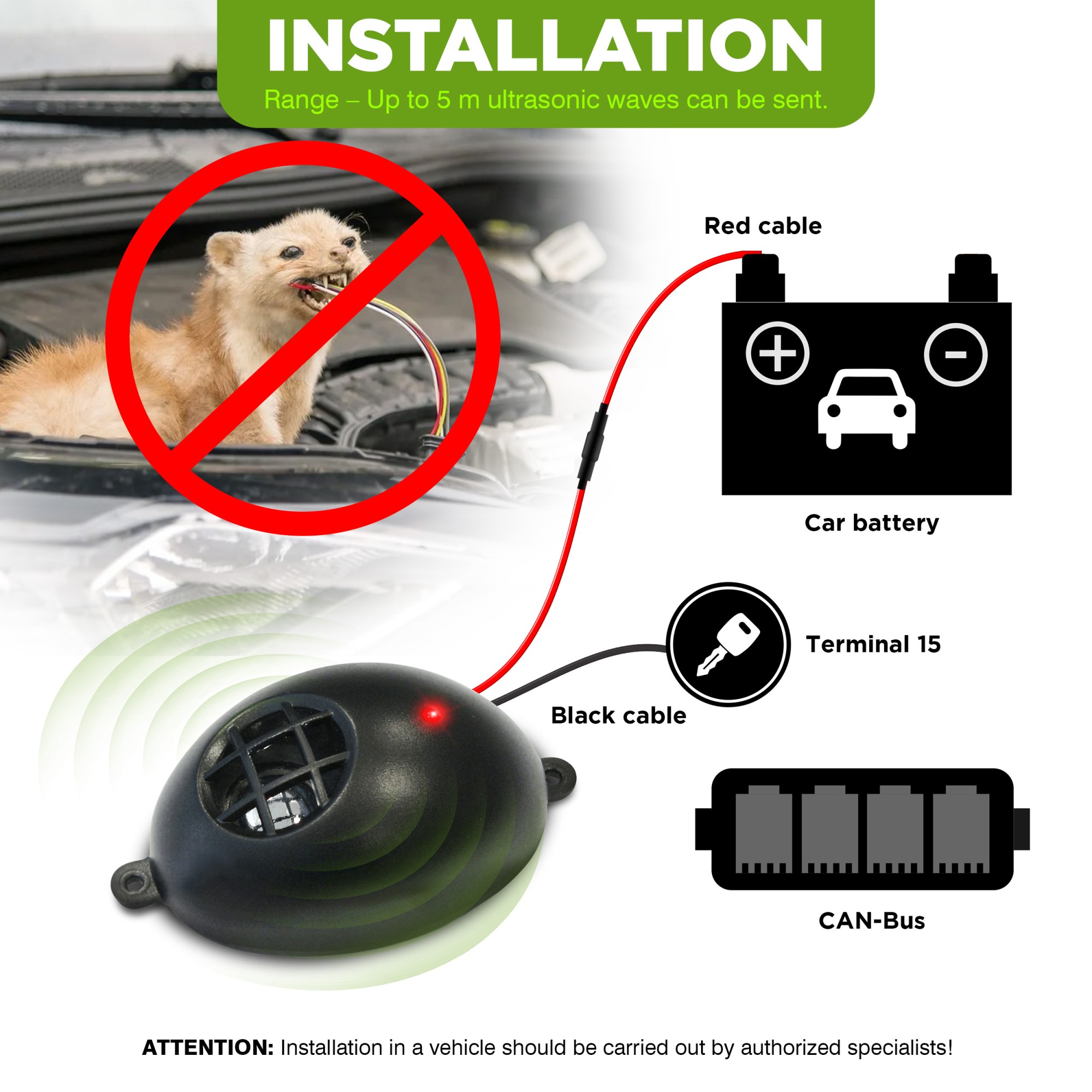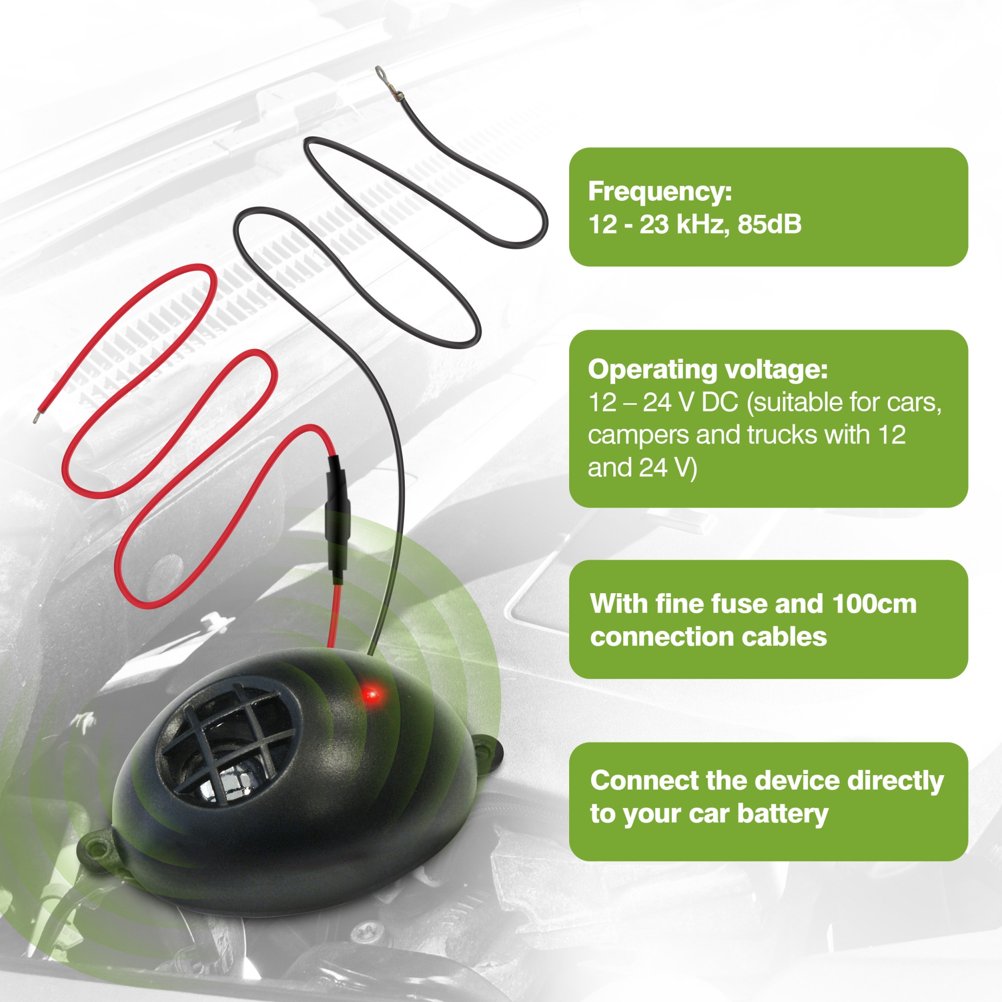 Репелент против куни за монтаж в превозни средства. Устройството издава къси високочестотни звуци в 3-секундни интервали. M407 е идеален за превантивна защита на кабелите в моторното отделение на превозното средство. Устройството се захранва от 12V/24V автомобилна батерия и трябва да бъде свързано към контакт №15, което гарантира, че при стартиране репелентът автоматично се изключва.