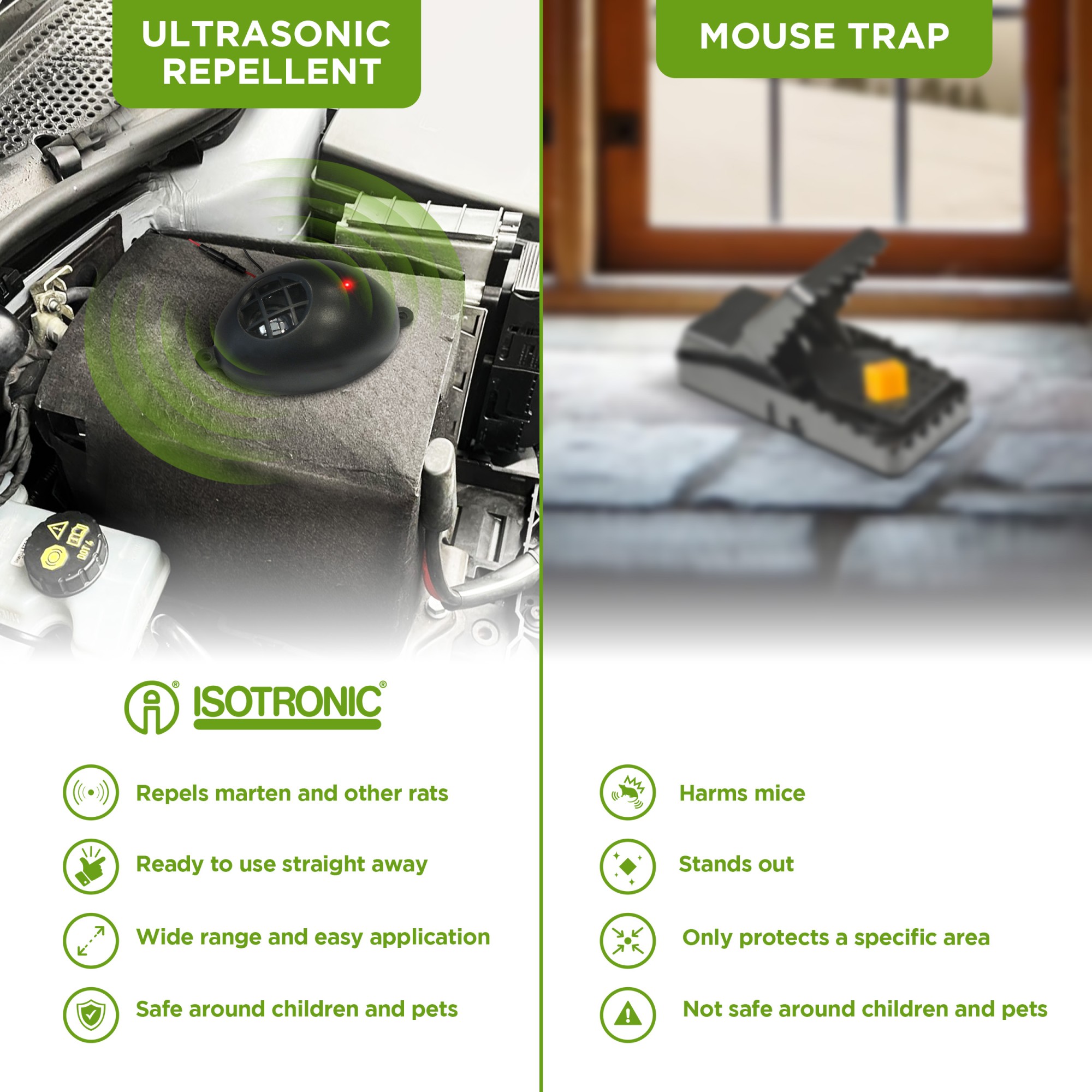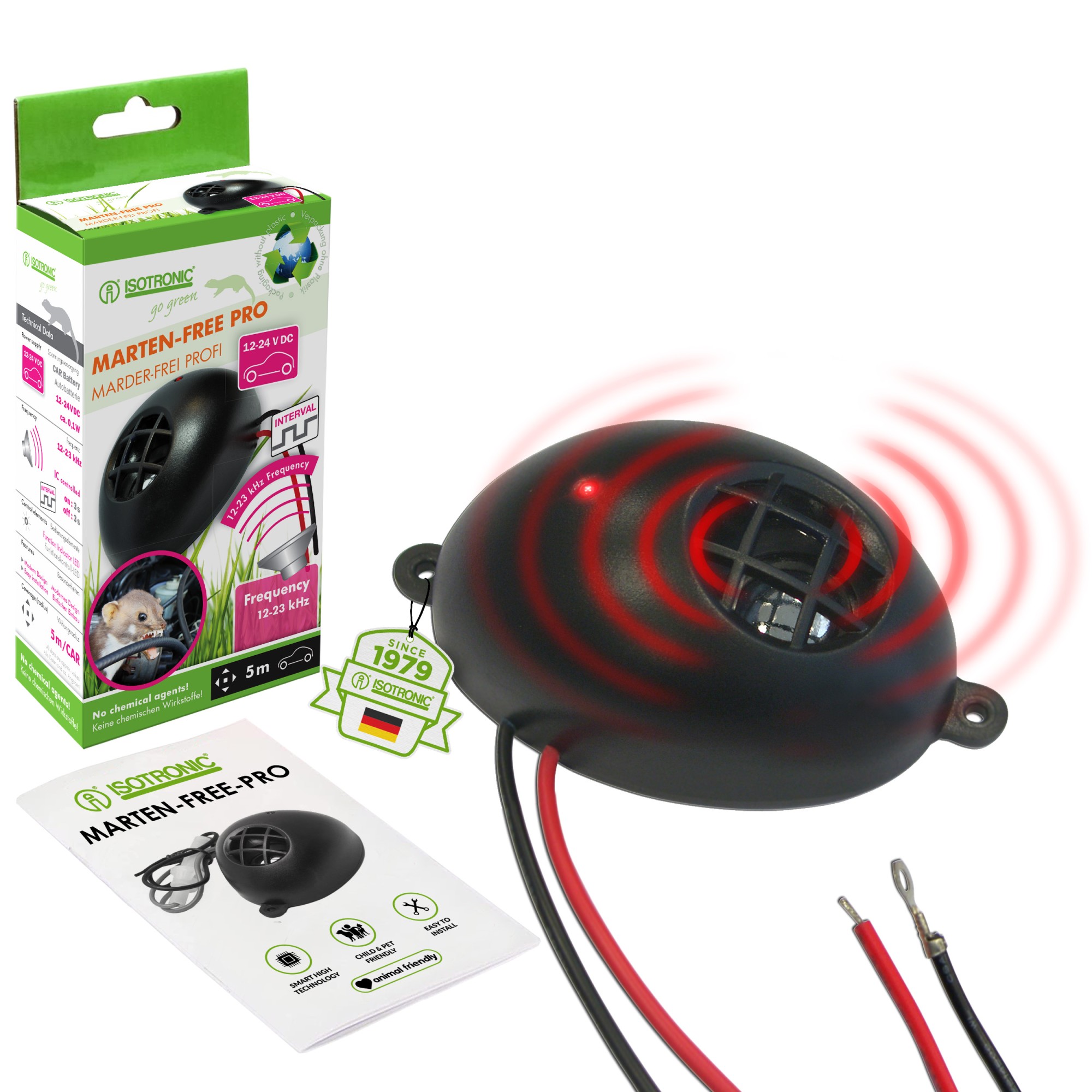 Репелентите Isotronic представляват надеждно и щадящо решение за защита на превозни средства, домове или гаражи от нежелани посетители като куници, мишки, плъхове или други вредители. Тези електронни репеленти използват ултразвукови сигнали или импулсно напрежение, които са неприятни за животните, но напълно безопасни за човека. В асортимента ще намерите компактни модели предназначени за монтаж в моторното отделение, както и универсални уреди за използване в интериора на сгради. Репелентите Isotronic са известни с дълъг живот, ниска консумация и лесен монтаж. Защитете вашето превозно средство или имущество от повреда на кабели или изолация. С марката Isotronic получавате тих, но много ефективен защитник.