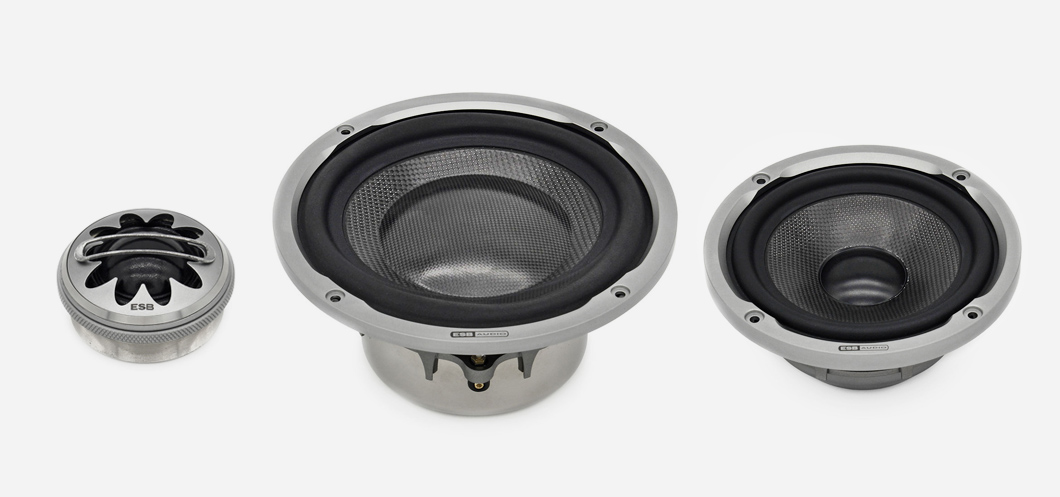 Репродукторите ESB от серия 9000 (Novemila) са сред технологично най-напредналите автомобилни говорители, някога произведени. И също така сред най-елегантните! Технологията и дизайнът се съчетават в нова и необичайна естетика, благодарение на изключителната цветна форма около мембраната на високочестотния говорител и също така по кошовете на басовия и средночестотния говорител. Този луксозен дизайн не е създаден само заради естетиката. Той е израз на иновация, която позволява акустичният завой на краищата на високочестотните говорители да бъде по-малко изразен и да се адаптира към дизайна на говорителите. Аналогия можете да намерите в новите двигатели Rolls-Royce за най-съвременни самолети, които притежават същата форма на задния ръб. Точно там, където въздухът излиза и се образуват основните турбуленции. С новата конструкция тези двигатели постигнаха големи предимства като намаляване на шума в кабината с 10 dB и също така намаляване на разхода на гориво с 10 %. Но това не е просто случайно сходство. Конструкцията на хай-енд говорителите ESB и на двигателите Rolls-Royce произлиза от същия принцип — да се намалят нежеланите акустични ефекти по ръбовете на говорителите, съответно на двигателите. ESB Audio 9.6K3 представлява референтен три-лентов комплект, съставен от 165 mm басов говорител, 100 mm средночестотен говорител и 28 mm високочестотен говорител, който впечатлява не само с използваните технологии и дизайн, но най-вече с абсолютно зашеметяващ звук.