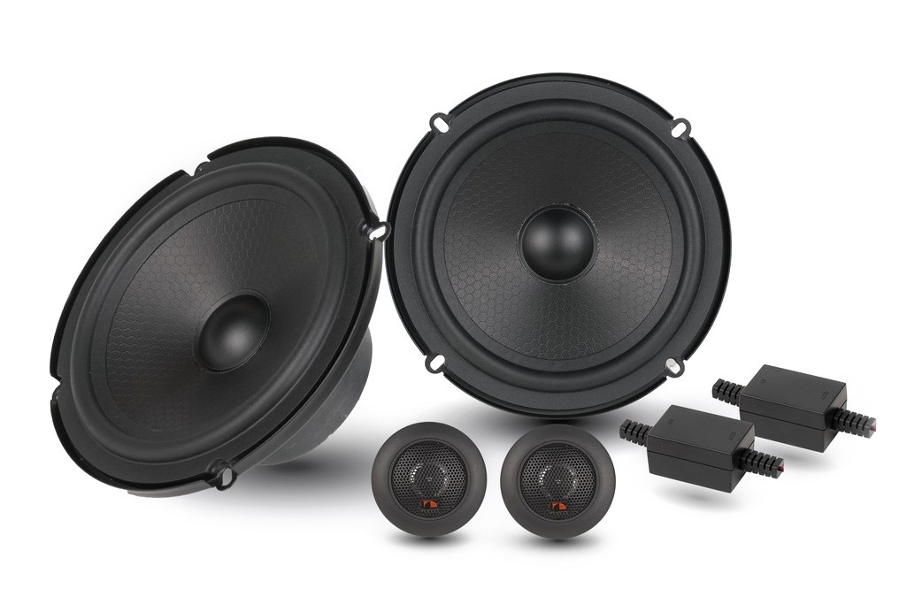 | Тип на високоговорителитеКоаксиални високоговорители: Коаксиалните високоговорители се характеризират с конструкция, наречена всичко в едно. Високочестотният и среднобасовият говорител са в един и същ кош. Предимството е по-лесен монтаж, но поради свързването или близостта на честотните диапазони в един говорител обикновено се понижава качеството на звука. Обикновено в центъра на среднобасовия говорител се намира високочестотният говорител, чиито звукова бобина работи във втората въздушна междина на общия магнитен кръг. Коаксиален говорител с три честотни диапазона се състои от среднобасов говорител, отпред на специален носач е поставен средночестотният говорител и отделен високочестотен. Компонентни високоговорители: Компонентните високоговорители се отличават с разделянето на отделни честотни диапазони: високочестотен + среднобасов + евентуално басов диапазон. Отделните говорители могат да бъдат разположени напълно отделно, което води до по-добро звуково и акустично представяне. В огромното мнозинство от случаите при компонентните високоговорители се доставя и външна кросоувърна мрежа, която разделя високите, средните/среднобасовите и при системи с три честотни диапазона и басовите честоти, както и позволява настройване на нивото в децибели на високочестотния говорител (напр. +2 dB, 0 dB, -2 dB), стръмността (напр. 6 dB/октава, 12 dB/октава) или активно/bi-amp свързване. | Компонентни двулентови |