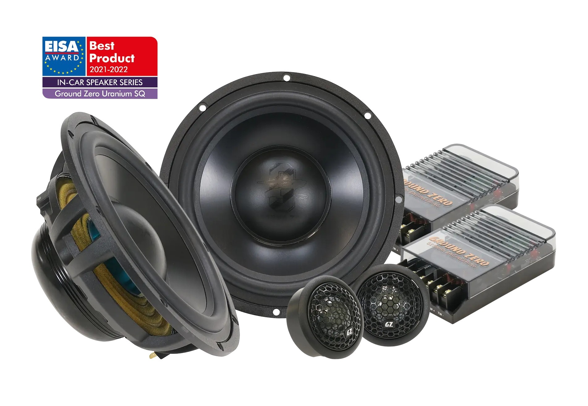 Reproduktory Ground Zero GZUC 165.2SQ от модулната серия Uranium представляват висококачествен 2-пътен компонентен система с диаметър 165 mm, идеален избор за взискателни потребители, търсещи динамичен, детайлен и верен звук. Комплектът включва средночестотен говорител с черно анодизирана алуминиева мембрана, която се отличава с изключителна твърдост, ниско тегло и отличен топлоразпрей, което допринася за прецизно и неутрално възпроизвеждане дори при висока мощност. Конструкцията включва също здрава алуминиева пресована кошница и висококачествен гумен окачващ механизъм за потискане на нежеланите вибрации. Рядкост в този ценови клас е и високопроизводителният неодимов магнит на средночестотния говорител, който предлага висока мощност и отличен контрол. Високочестотният говорител с 25 mm копринен купол и линеен неодимов магнит осигурява фини и детайлни високи честоти. Цялата система е допълнена с прецизно настроена пасивна кросоувър мрежа с качествени компоненти и възможност за намаляване на нивото на високите честоти. Този модел е получил и престижната награда EISA, която потвърждава неговото изключително изпълнение и техническа изработка, призната от експерти в областта на потребителската електроника.Основни спецификации на високата серия Ground Zero Uranium