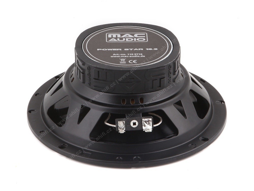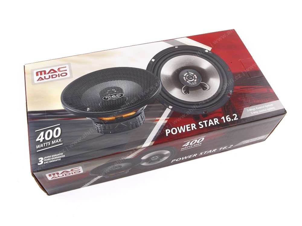 Звуково, дизайнерски и по отношение на производителността популярната серия говорители Mac Audio е Power Star. Моделът с обозначение 16.2 са 2-посочни коаксиални говорители, които могат да понесат до 400 W максимална мощност в широк честотен обхват. Разполагат с издръжлив гумен окачващ ръб, който е залепен върху лека и стабилна мембрана от полипропилен. Системата на говорителя е направена така, че подвижната бобина се охлажда самостоятелно. От задната част на говорителя ще ви зарадва лазерно гравираното лого на марката. Цялата система е оптимизирана чрез измервания Klippel за перфектен звук в тази ценова категория. В опаковката е включена и здрава защитна решетка с логото на марката за двата говорителя в комплекта. Подробно представяне на цялата серия Power Star можете да намерите в нашия блога, където разглеждаме тази моделна серия.
