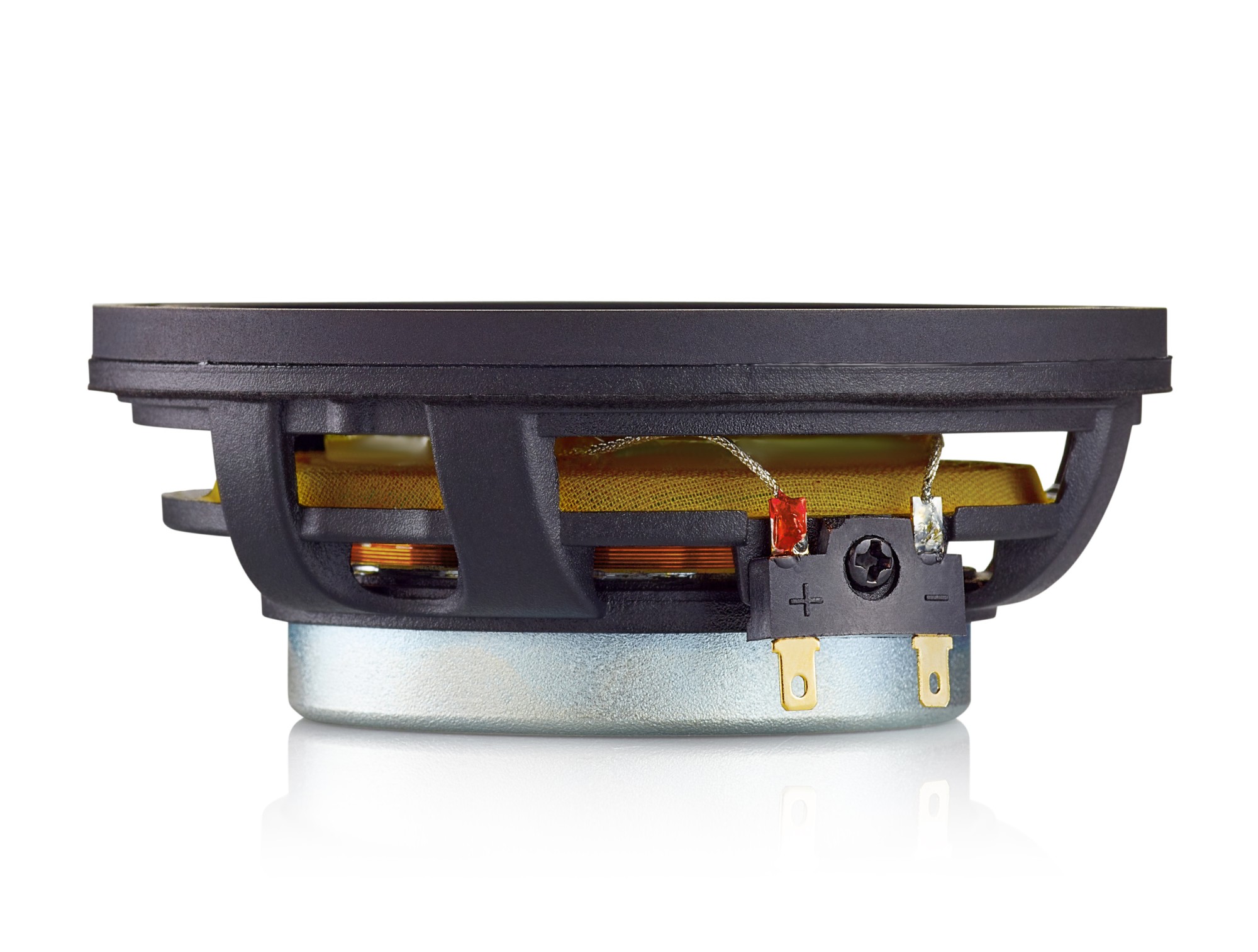 | Тип на високоговорителитеКоаксиални високоговорители: Коаксиалните високоговорители се характеризират с конструкция, наречена всичко в едно. Високочестотният и среднобасовият говорител са в един и същ кош. Предимството е по-лесен монтаж, но поради свързването или близостта на честотните диапазони в един говорител обикновено се понижава качеството на звука. Обикновено в центъра на среднобасовия говорител се намира високочестотният говорител, чиито звукова бобина работи във втората въздушна междина на общия магнитен кръг. Коаксиален говорител с три честотни диапазона се състои от среднобасов говорител, отпред на специален носач е поставен средночестотният говорител и отделен високочестотен. Компонентни високоговорители: Компонентните високоговорители се отличават с разделянето на отделни честотни диапазони: високочестотен + среднобасов + евентуално басов диапазон. Отделните говорители могат да бъдат разположени напълно отделно, което води до по-добро звуково и акустично представяне. В огромното мнозинство от случаите при компонентните високоговорители се доставя и външна кросоувърна мрежа, която разделя високите, средните/среднобасовите и при системи с три честотни диапазона и басовите честоти, както и позволява настройване на нивото в децибели на високочестотния говорител (напр. +2 dB, 0 dB, -2 dB), стръмността (напр. 6 dB/октава, 12 dB/октава) или активно/bi-amp свързване. | Компонентни 2-полосни |