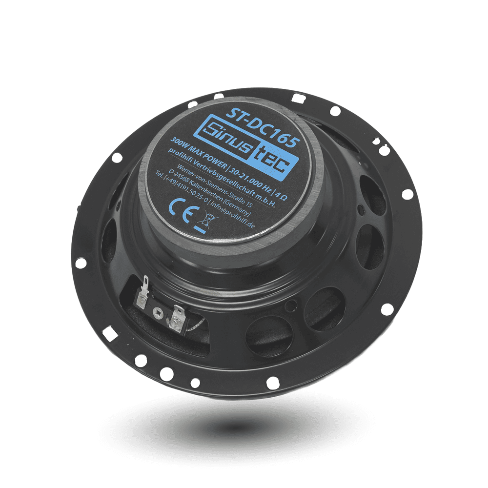 | Диаметър на среднебасовия говорителДиаметърът на говорителя се посочва като диаметър на целия говорител, без да се включват монтажните закрепвания, при които при по-малките говорители (87, 100, 130 mm) закрепванията може да стърчат допълнително. Някои говорители са овални и там размерът се дава в инчове, винаги от най-късата към най-дългата страна. Един инч е приблизително 2,5 cm. | 165 mm |