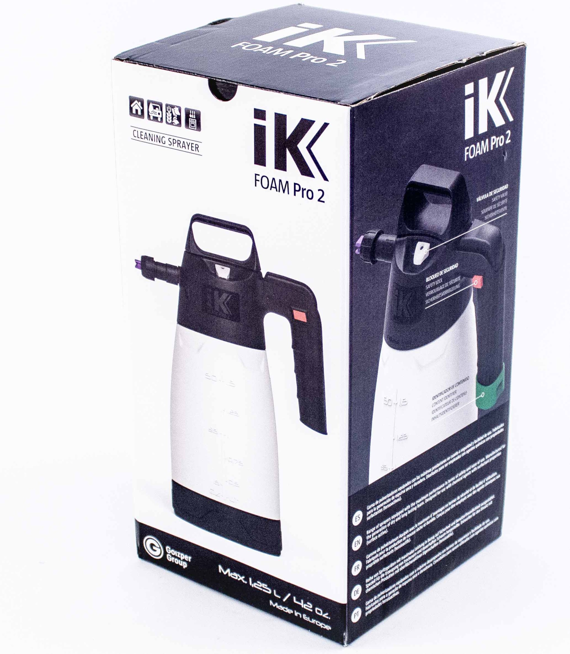 IK FOAM PRO 2 Professional Sprayer е ръчен професионален пенообразувател под налягане с вместимост 1250 ml, проектиран за създаване на суха, средна и влажна пяна. Благодарение на повишената химическа устойчивост, здрава конструкция и трите смесителя (оранжев, сив, зелен) предлага възможност за регулиране на плътността на пяната и универсално приложение в различни отрасли. Идеален е за професионално почистване, санитарна обработка и дезинфекция, използване в автомобилния детайлинг, почистване на HVAC системи и в хранително-вкусовите производства. Пръскачката е оборудвана с широко горло за пълнене, полупрозрачен съд, предпазен вентил, настроен на налягане 3 бара и стабилна основа. Цветните капачки позволяват лесна идентификация на съдържанието, а заключващият механизъм осигурява надеждна и безопасна експлоатация.