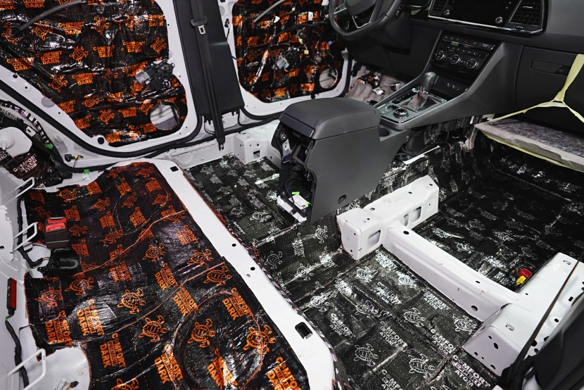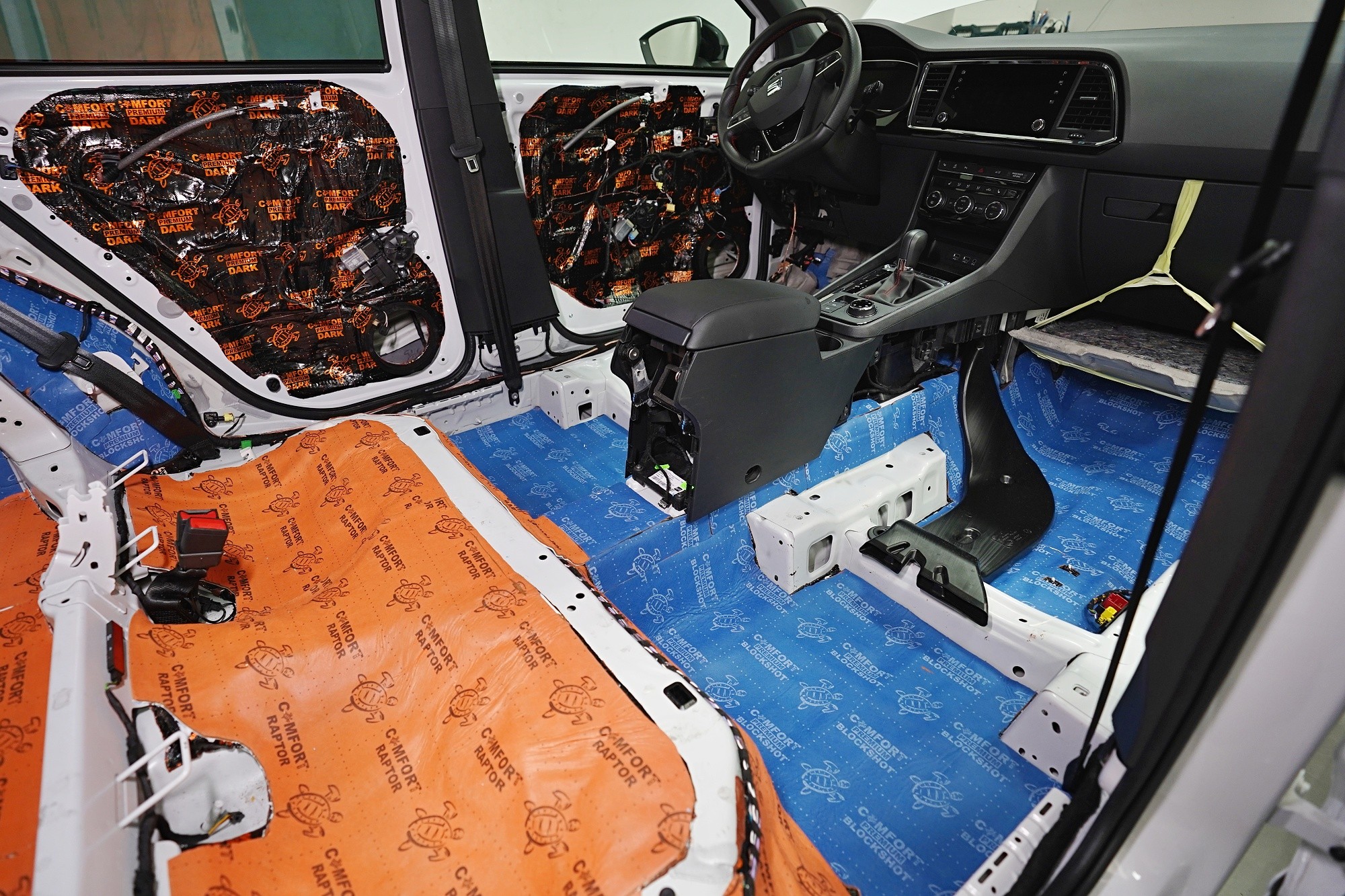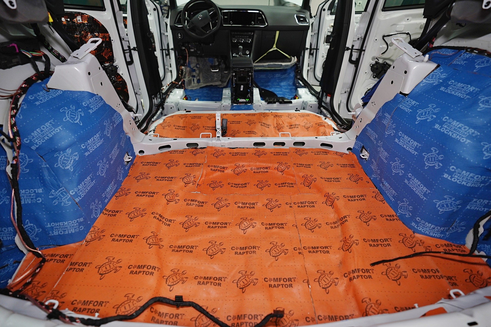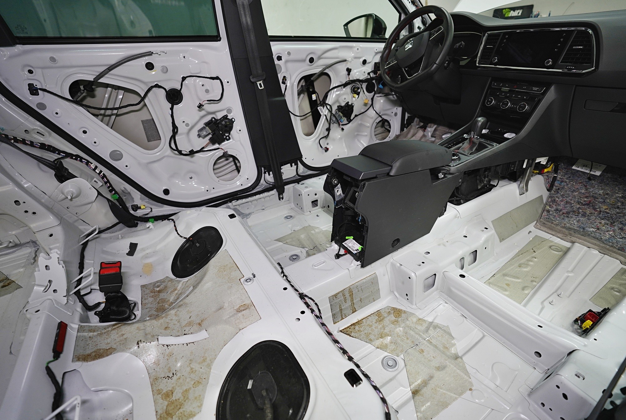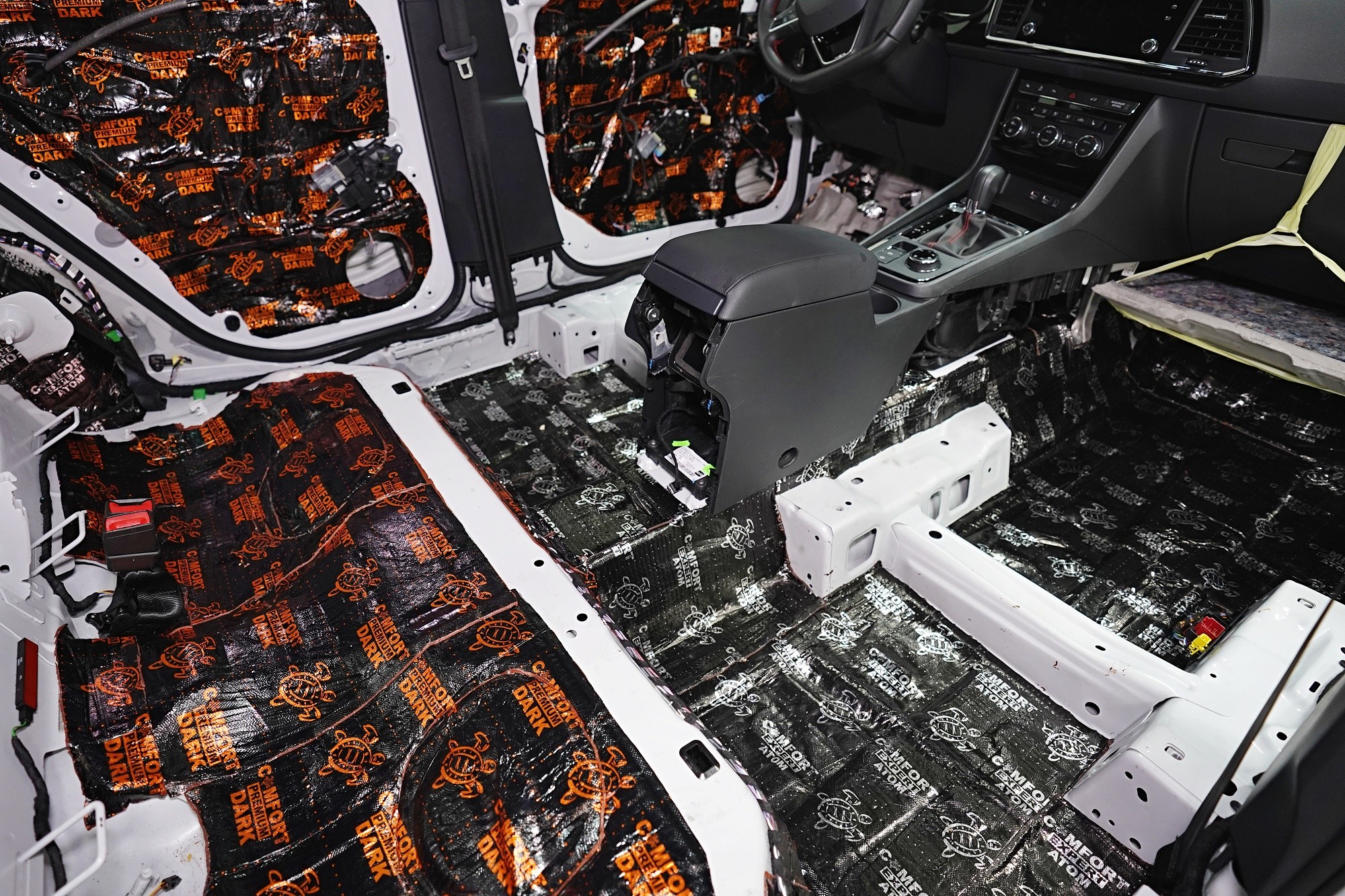 Шумоизолация на испанския SUV Seat Ateca в спортната версия FR. Това близнак на популярния чешки еквивалент Škoda Karoq е технически почти идентичен, произвежда се в същия завод в Kvasinách и освен отпред и отзад представлява практически същия автомобил. За нас Ateca е по-успешна от гледна точка на дизайн и двигателят 2,0 TSI с мощност 140 kW в комбинация със седемстепенна автоматична скоростна кутия определено е по-интересен избор. Личните симпатии обаче нека оставим настрана и да погледнем заводската звукоизолация. Тя е напълно идентична с тази при Škoda Karoq, с други думи на много ниско ниво. Гол метал с точкова защита срещу вибрации и звукоизолация, присъстваща само във вид на гума в предната част на пода. С увеличаване на скоростта започват да се проявяват шумове от предните и задните гуми, шум от двигателя и скоростната кутия, както и околен пътен и аеродинамичен шум. Решението е комплексна звукоизолация с първокласни материали Comfortmat и то в нашия пакет шумоизолация Expert. Той включва шумоизолация на всички важни части на автомобила, конкретно предните, задните и петите врати, пода, покрива, багажното отделение, капака, таблото и предните и задните вътрешни калници. За шумоизолацията едновременно работят четирима наши опитни техници, които извършват монтажа в рамките на 1 ден.