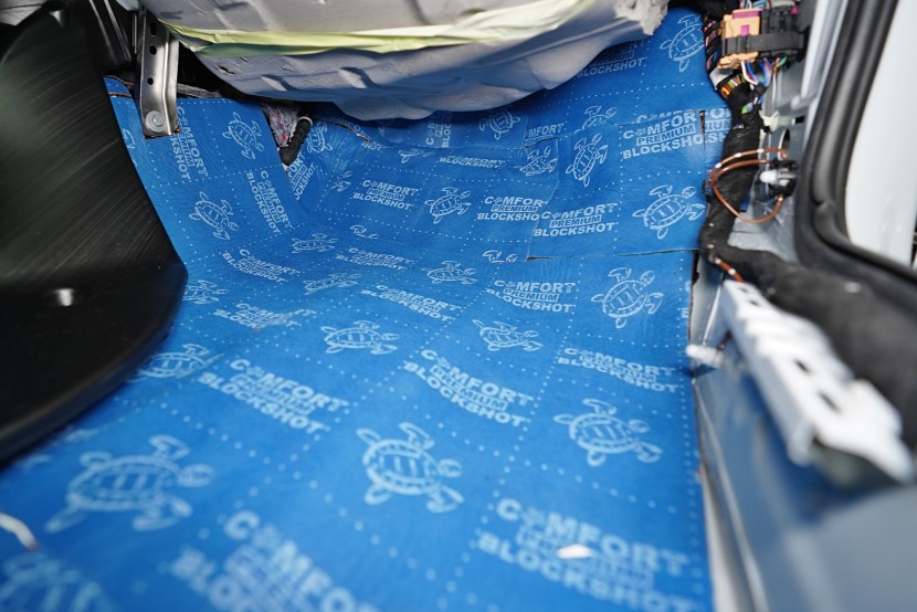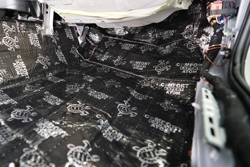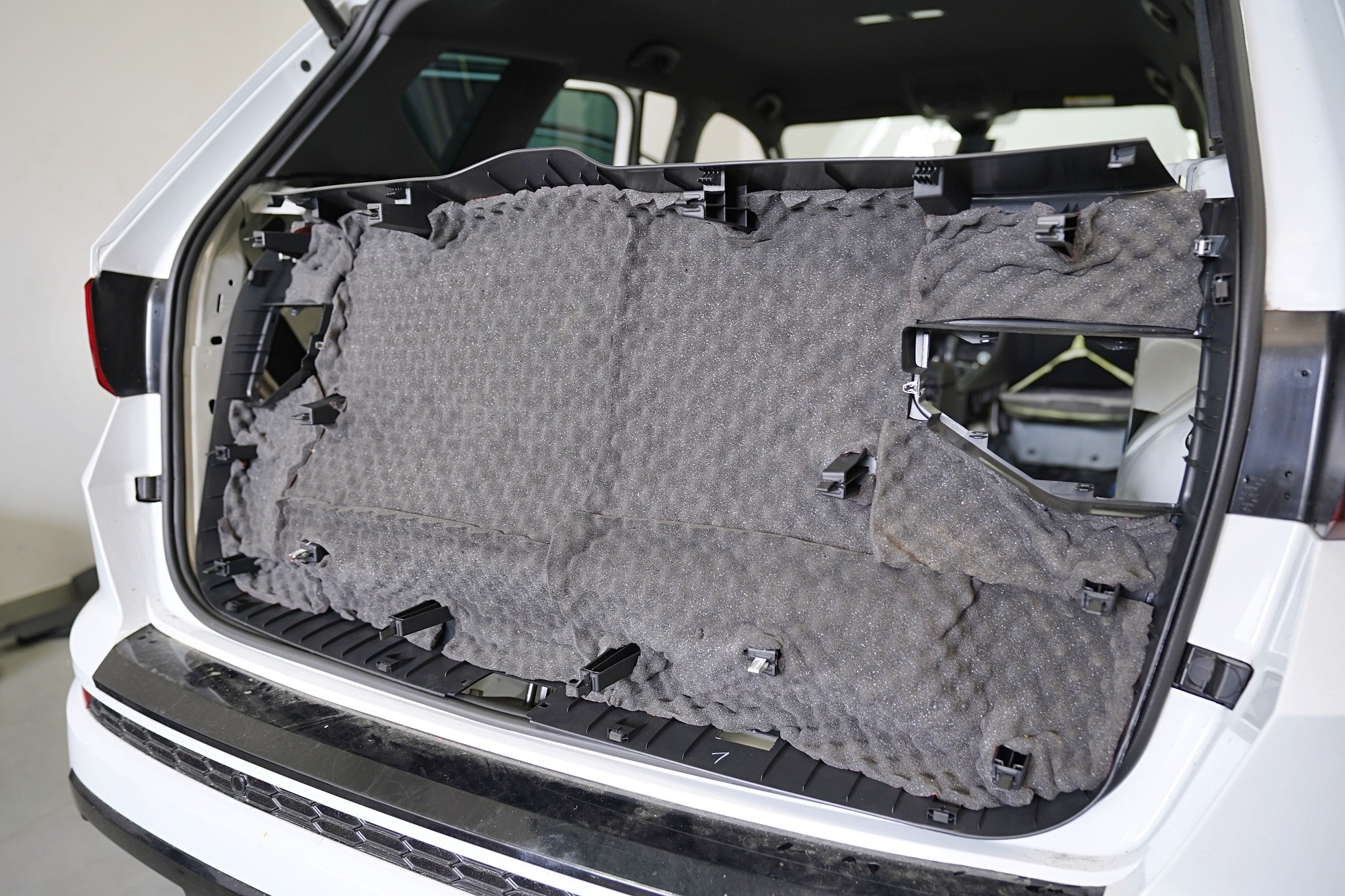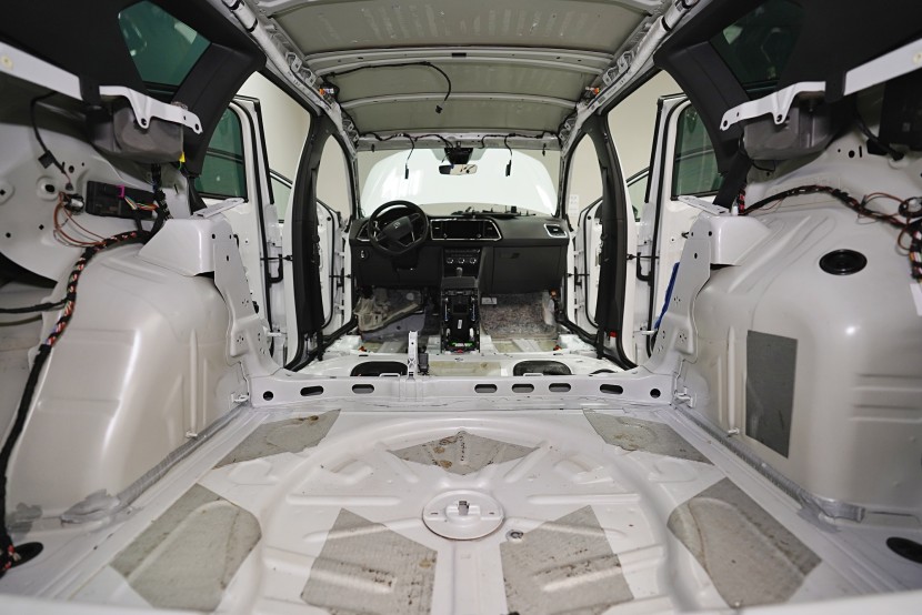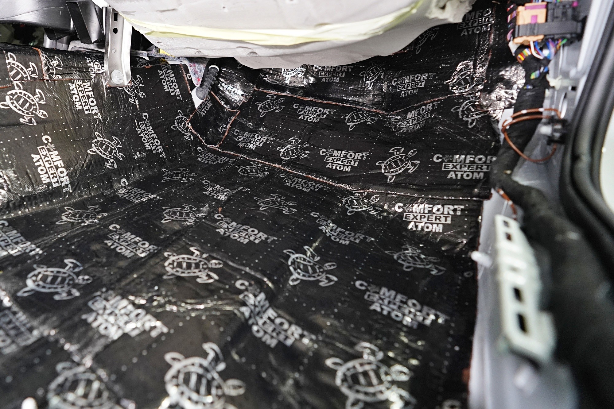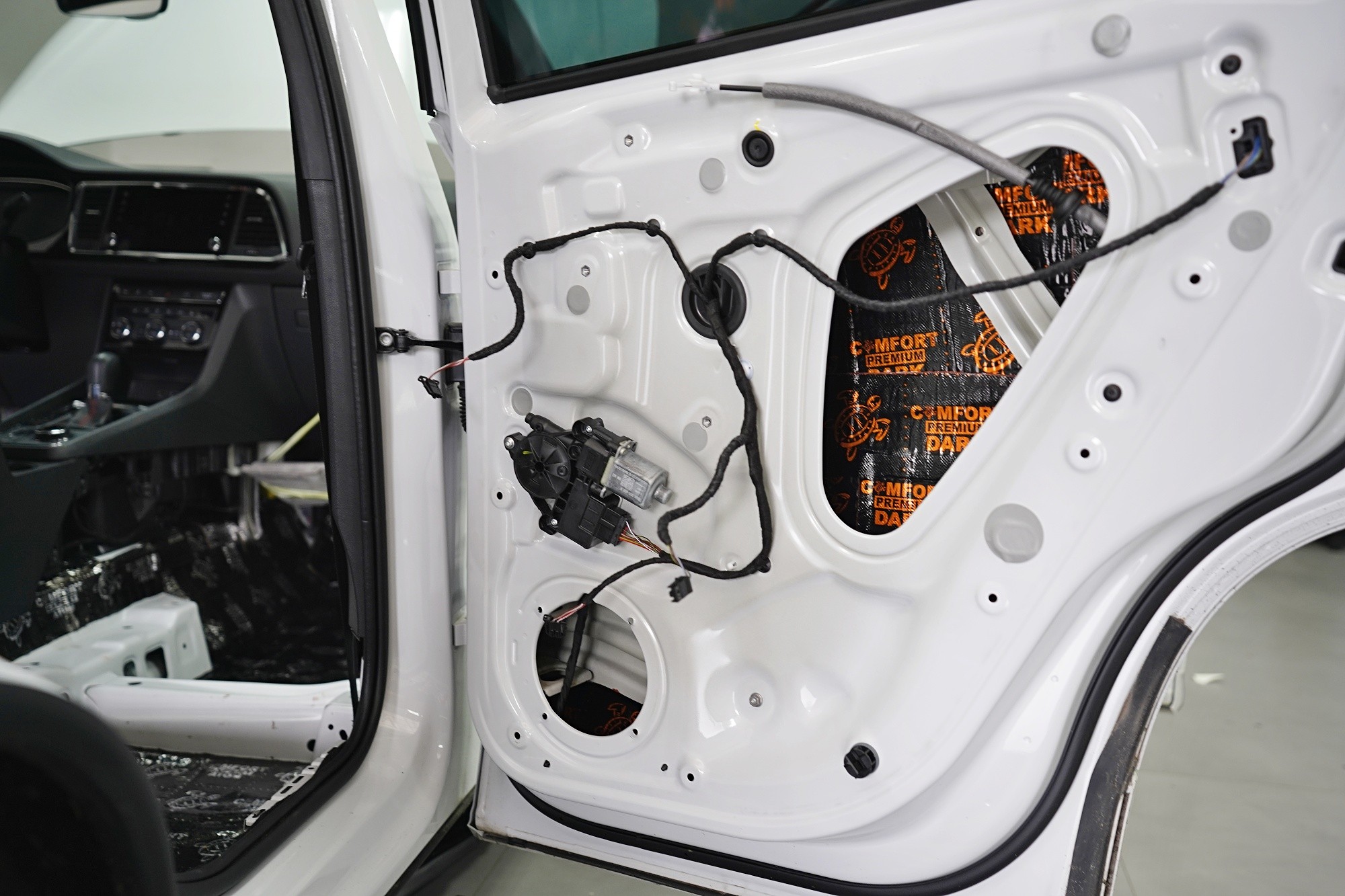 Шумоизолация на испанския SUV Seat Ateca в спортната версия FR. Това близнак на популярния чешки еквивалент Škoda Karoq е технически почти идентичен, произвежда се в същия завод в Kvasinách и освен отпред и отзад представлява практически същия автомобил. За нас Ateca е по-успешна от гледна точка на дизайн и двигателят 2,0 TSI с мощност 140 kW в комбинация със седемстепенна автоматична скоростна кутия определено е по-интересен избор. Личните симпатии обаче нека оставим настрана и да погледнем заводската звукоизолация. Тя е напълно идентична с тази при Škoda Karoq, с други думи на много ниско ниво. Гол метал с точкова защита срещу вибрации и звукоизолация, присъстваща само във вид на гума в предната част на пода. С увеличаване на скоростта започват да се проявяват шумове от предните и задните гуми, шум от двигателя и скоростната кутия, както и околен пътен и аеродинамичен шум. Решението е комплексна звукоизолация с първокласни материали Comfortmat и то в нашия пакет шумоизолация Expert. Той включва шумоизолация на всички важни части на автомобила, конкретно предните, задните и петите врати, пода, покрива, багажното отделение, капака, таблото и предните и задните вътрешни калници. За шумоизолацията едновременно работят четирима наши опитни техници, които извършват монтажа в рамките на 1 ден.