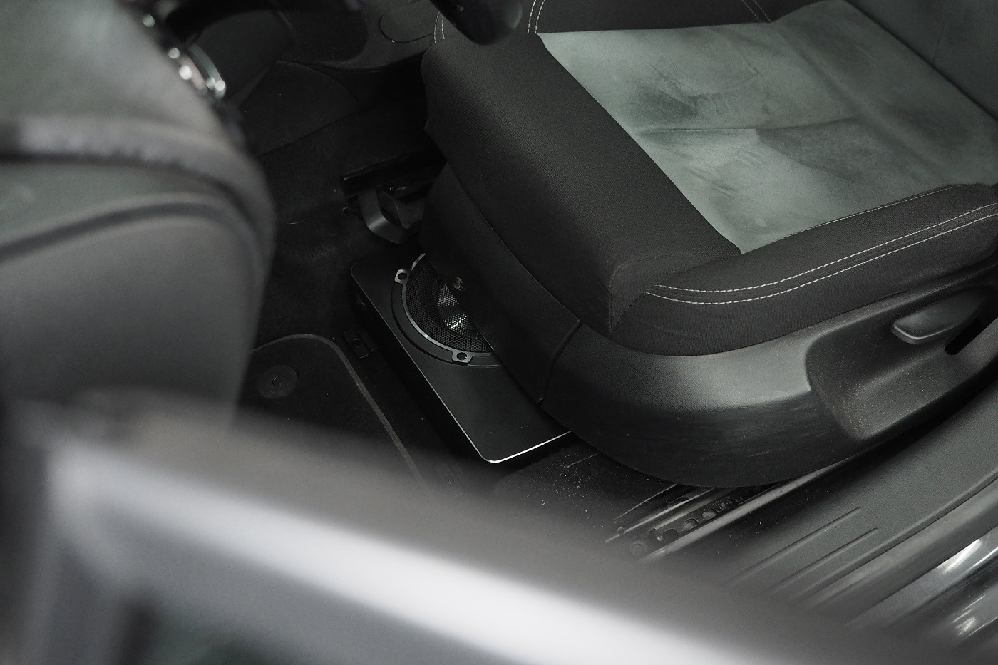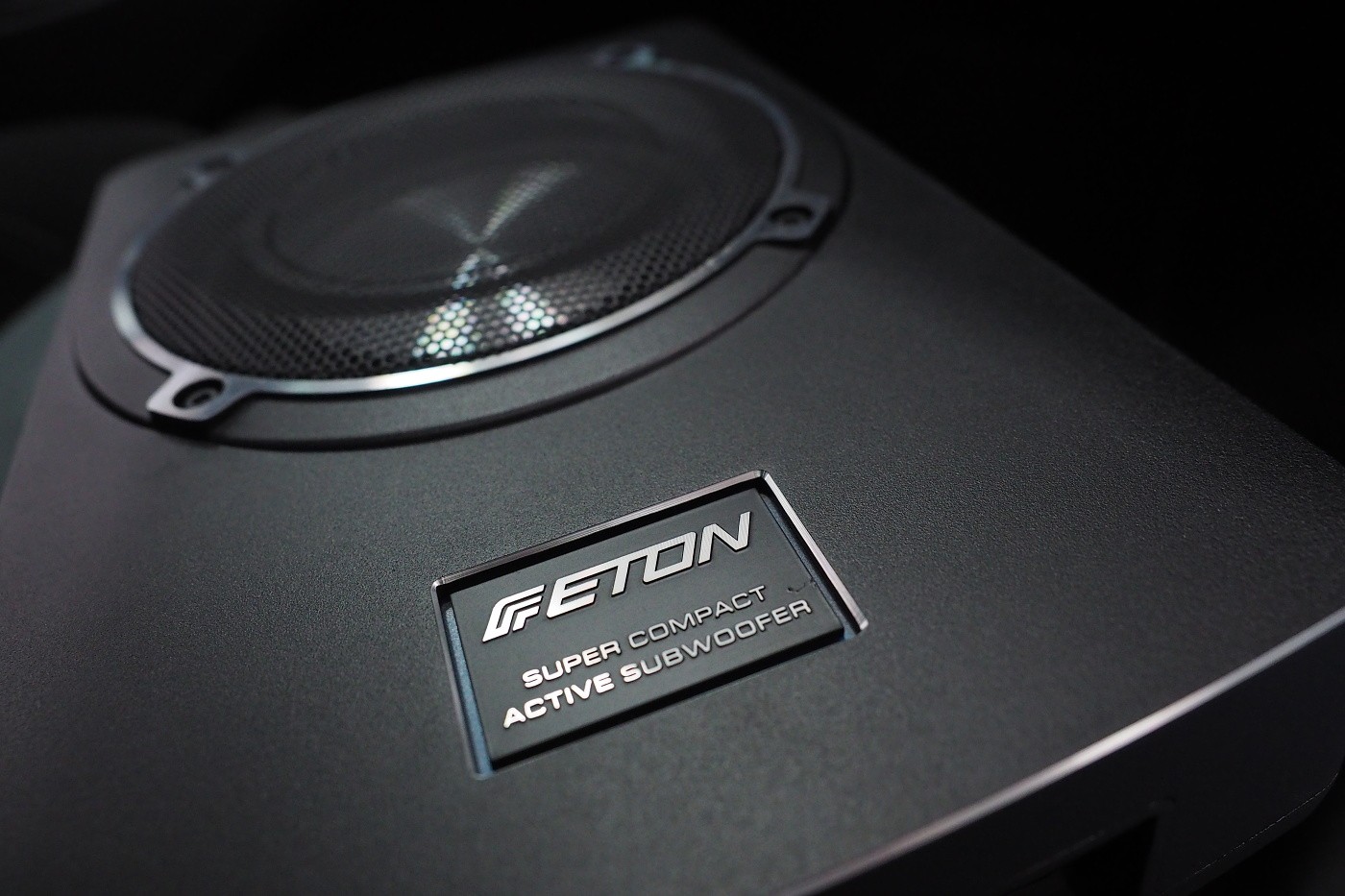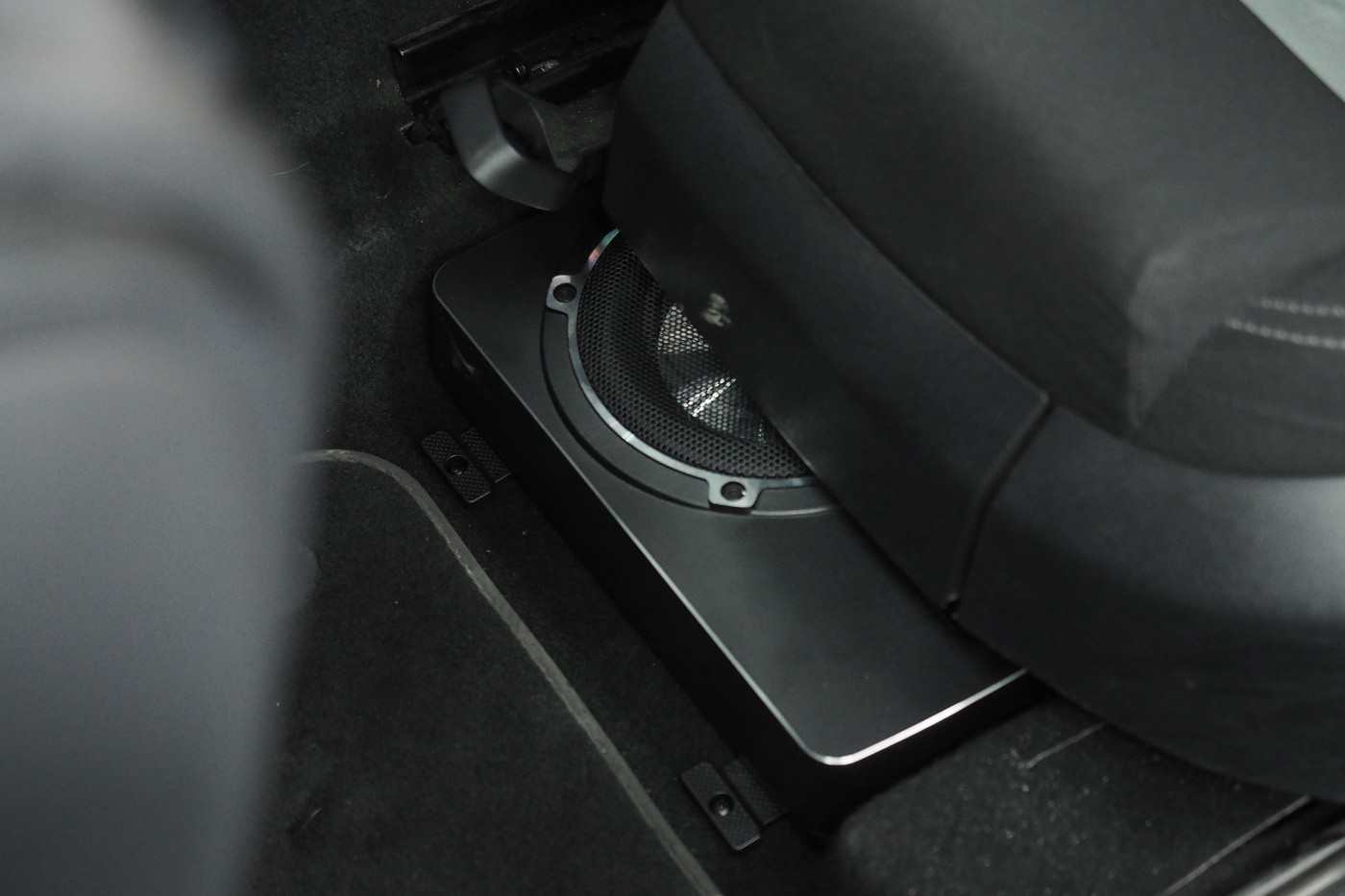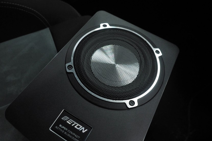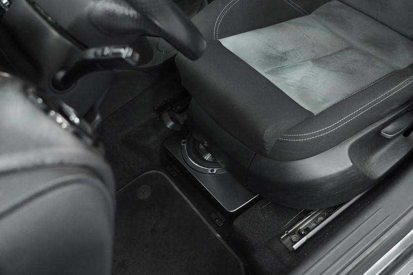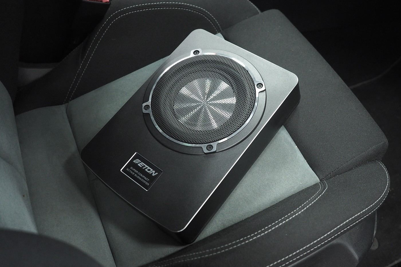 Монтаж на активен субуфер в автомобил Seat Leon. Ако искате да укрепите басовата част на озвучаването без да ограничавате обема на багажника, едно от решенията е инсталирането на плосък активен субуфер под седалката. За Seata Leon избрахме субуфер на немския производител Eton, който въпреки много малките си размери може значително да подобри общата динамика на озвучаването. Субуферът беше инсталиран под шофьорската седалка.