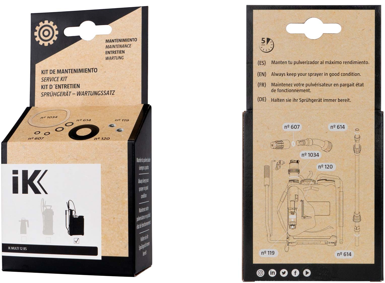 IK MULTI 12 BS maintenance kit е сервизен комплект, предназначен за налягащата пръскалка IK MULTI 12 BS. Съдържа всички необходими компоненти за бърза и лесна смяна на износени части, като по този начин удължава експлоатационния живот на устройството и осигурява оптимална производителност при ежедневна употреба. Смяната може да се извърши без необходимост от използване на инструменти.