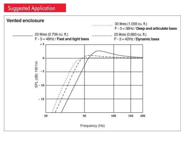 | Vas - еквивалентен обем на въздухаVas - представлява обемът на въздуха, който при компресиране с един кубичен метър оказва същата сила като поддържането (CMS) на окачването в даден субуфер. Vas е един от параметрите и е сред най-сложните за измерване, защото промените в атмосферното налягане, относителната влажност и температурата влияят на измерванията. Друг начин да опишем Vas: опитайте да използвате субуфера и да намерите такава кутия (озвучница), която има правилния обем, така че въздухът в нея да възвърне същата твърдост при резонанс. Размерът на тази кутия съответства на Vas. Има и други параметри, но те не са толкова необходими за точните изчисления на кутията. При изграждането на кутии също са важни стойностите на резонансната честота и Q-параметрите. | 24,34 l |