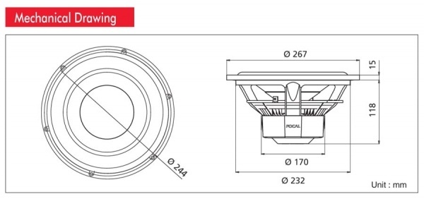 | Монтажна дълбочина на субуфераМонтажната дълбочина на субуфера се измерва от най-долния ръб на магнита до долния край на ламариненото или отлято кошче на субуфера. | 118 mm |