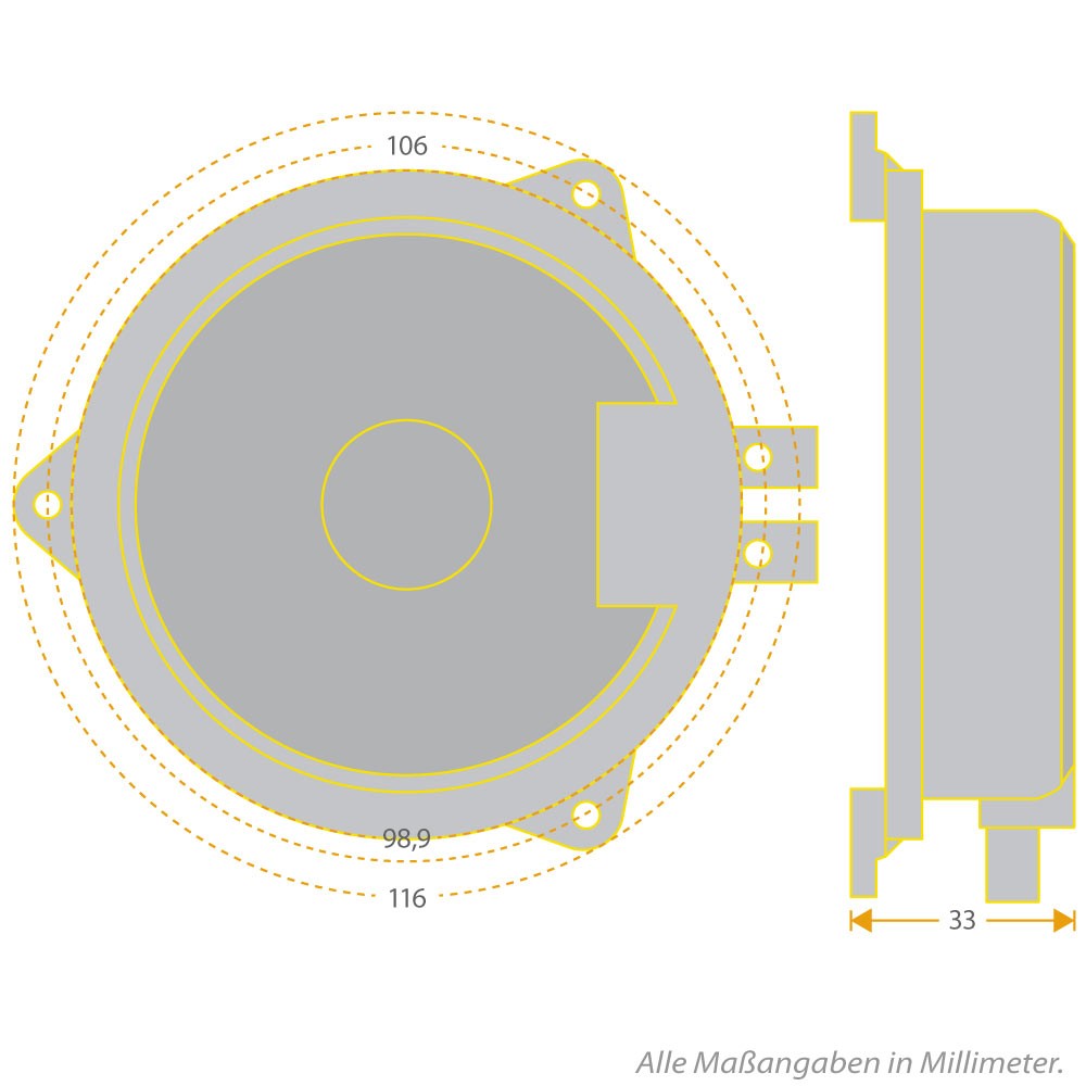 | Размери на кутиятаРазмерите на озвучителната кутия се посочват като височина, ширина и дълбочина, като дълбочината често е по-голяма в долния ръб отколкото в горния поради скосване на задната стена. | 116 x 33 mm |