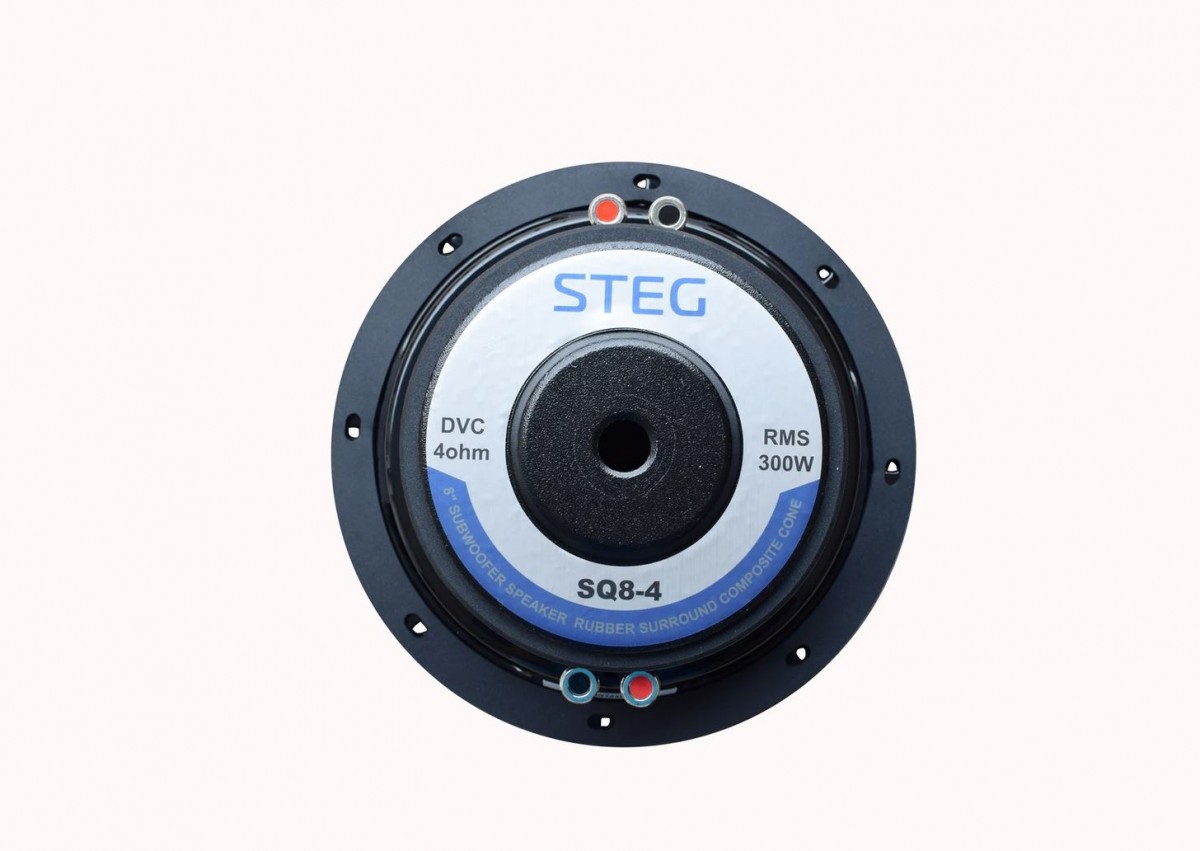 С цел да се осигури висока акустична мощност при малък обем на кутията бяха проектирани събуфърите SQ8-2 (2 + 2 Ω) и SQ8-4 (4 + 4 Ω) за използване в затворена кутия с обем 8,5 литра. Компонентите на събуфъра STEG SQ8 бяха разработени с основна цел — да осигурят висока ефективност в тясно пространство. Събуфърите STEG SQ8 използват специална геометрия, изследвана в лабораториите на STEG, която гарантира широк обхват на събуфъра и поддържа монтажната дълбочина до минимум. Окачването на мембраната беше внимателно проектирано, за да се предотврати явлението осцилация. Това позволява събуфърът да бъде монтиран близо до задната стена на кутията, като по този начин се използва максимално намалената монтажна дълбочина.