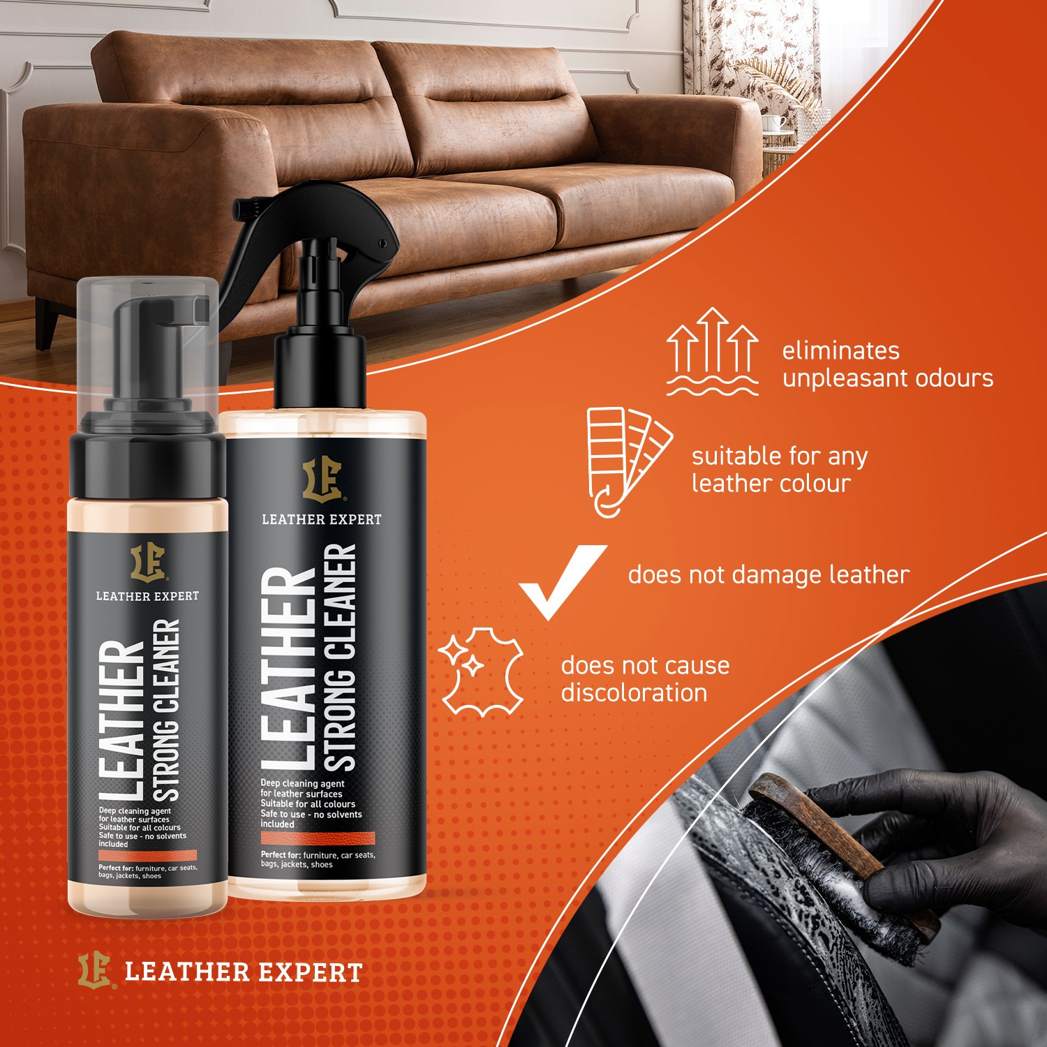 Този отличен препарат ефективно отстранява всички видове петна и замърсявания от повърхността на кожата, отстранява и неприятни миризми (напр. цигарен дим, човешко изпотяване и др.). Не уврежда кожата. Предназначен е за силно замърсена кожа. Leather Expert Strong Cleaner се използва за почистване на различни видове гладка кожа в автомобили, върху кожени мебели, кожени изделия, чанти и други предмети от кожа. Благодарение на специалния пенообразувател, Strong Cleaner създава богата и стабилна пяна, която допринася за отлични резултати при почистване. Продуктът е безопасен за околната среда, екологичен, биоразградим и не е тестван върху животни. Leather Expert Strong Cleaner има силни почистващи свойства. Не използвайте върху велур и нубук!Основни характеристики