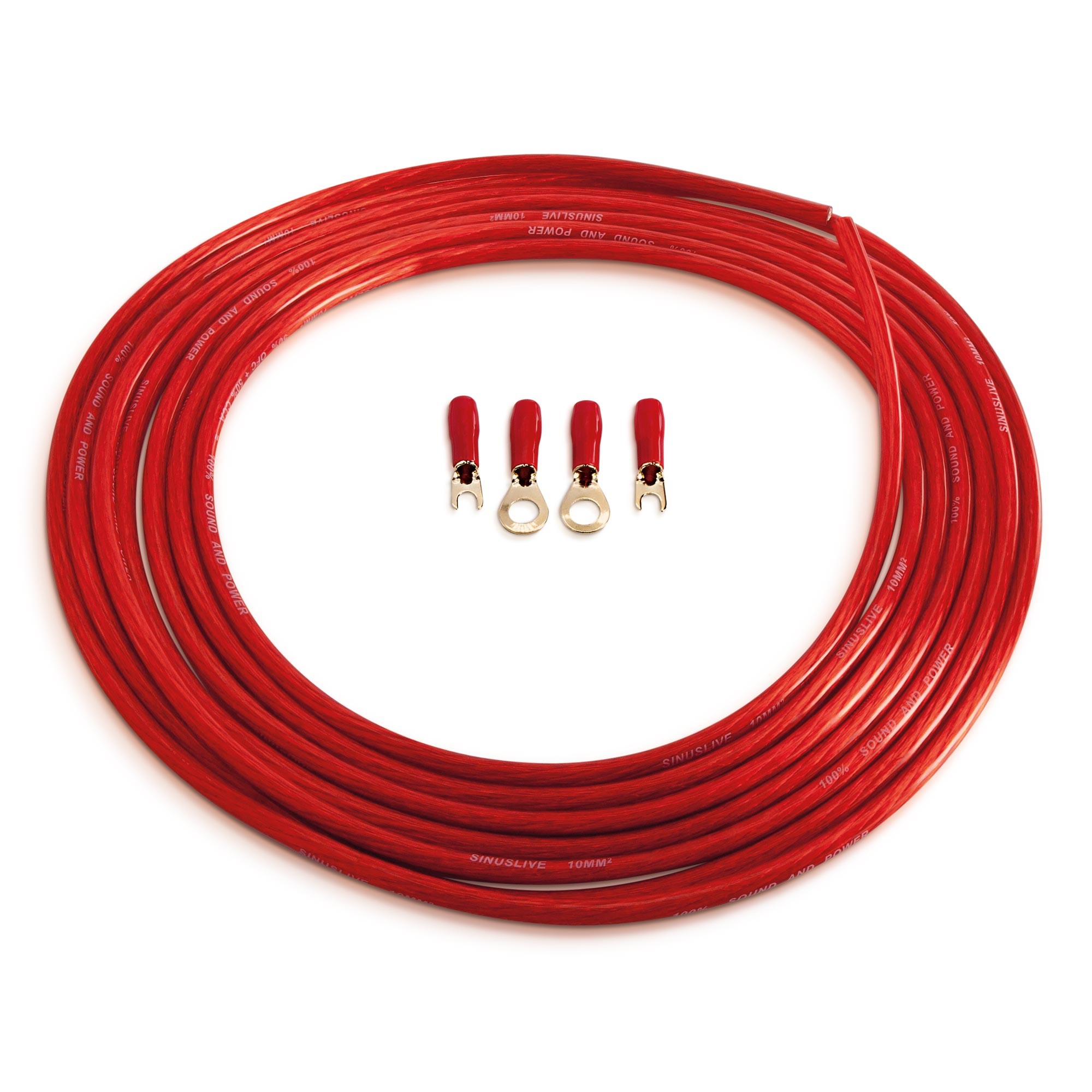 zахранващ кабел, CCA, сечение 10 mm², червена изолация, 5 метра, 2 уши + 2 вилици в опаковката