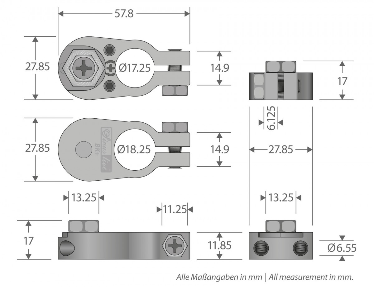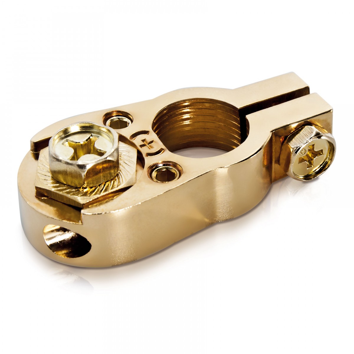 Плюсова позлатена клема за акумулатор, подходяща за всички обичайни видове акумулатори, осигурява дългосрочен пренос на ток без корозия. 2 кабелни входа до 10 mm². Допълнителен монтажен винт за кабелни уши с отвор 8,2 mm. Размери 58 x 28 x 12 mm.