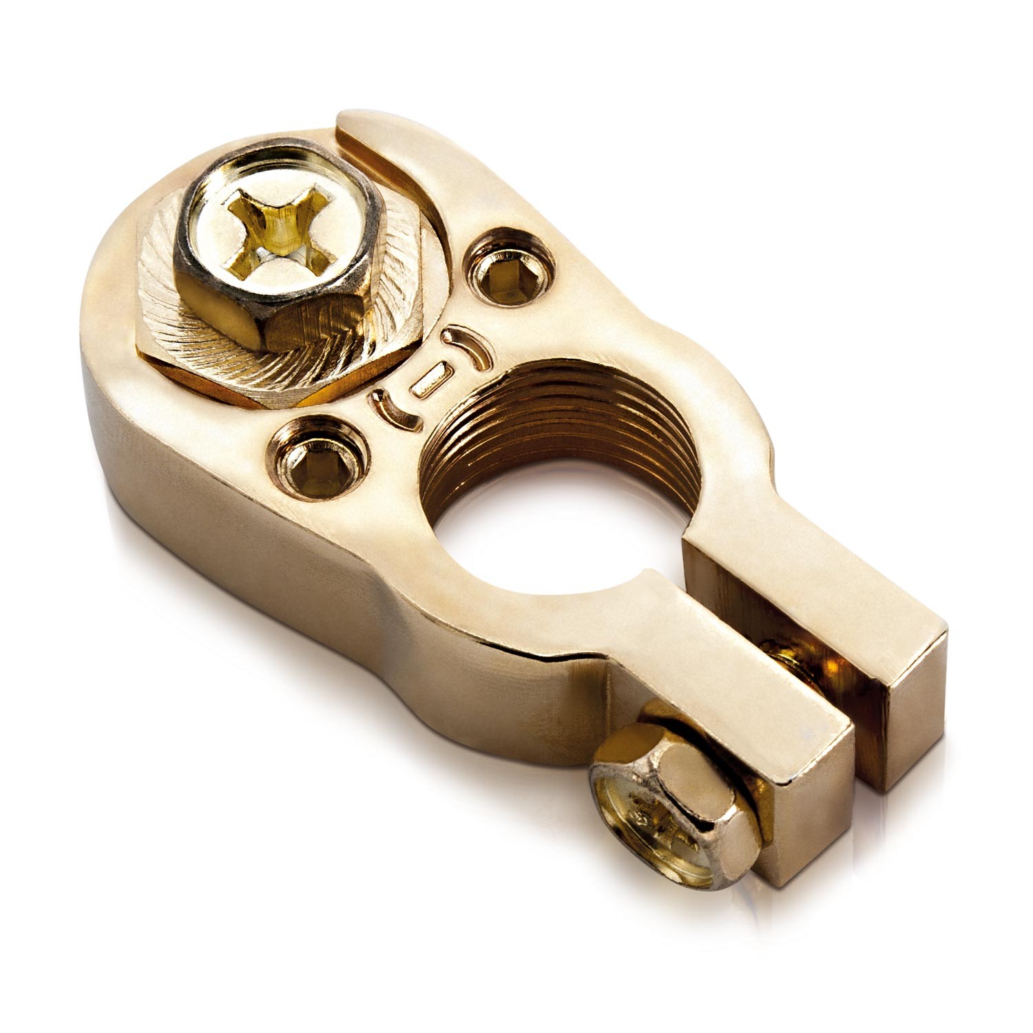 Отрицателна позлатена батерийна клема за всички обичайни видове акумулатори осигурява дългосрочен пренос на мощност без корозия. 2 входа за кабели до 10 mm². Допълнителен закрепващ винт за кабелни уши с отвор 8,2 mm. Размери 58 x 28 x 12 mm.