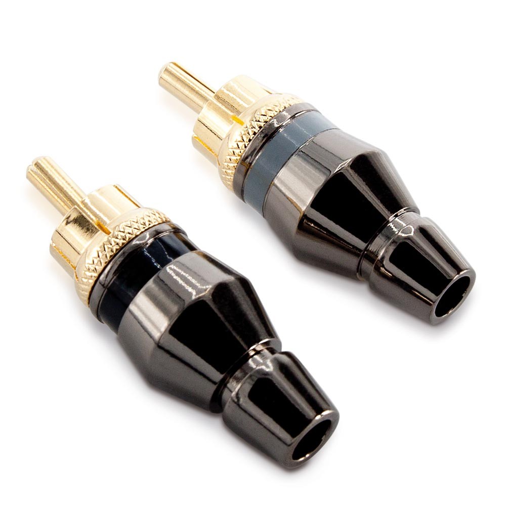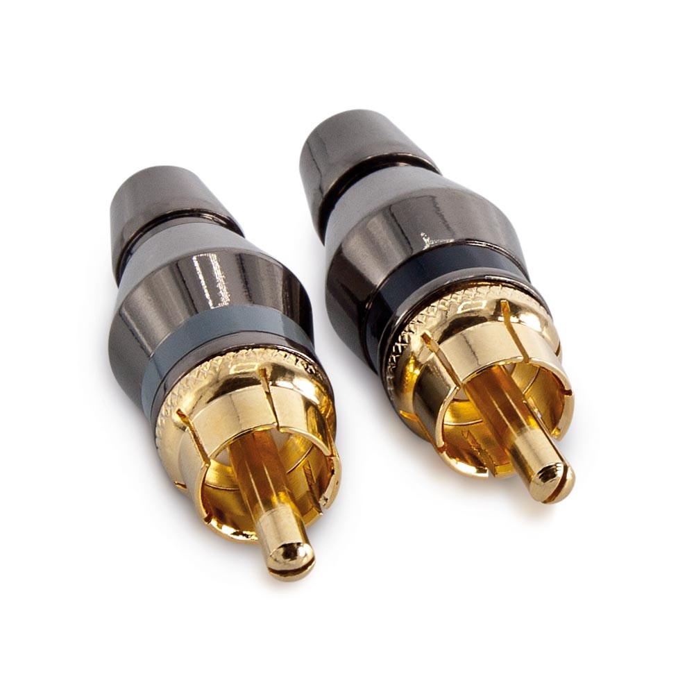 Два премиум RCA щекера за запояване. Щекерите са изработени от мед H58 и са позлатени. Ребристият централен щифт и прорезният щит осигуряват сигурно и безпроблемно захващане. Обвивките в антрацитен цвят се развиват лесно, така че RCA кабелът може да бъде запоен без затруднения. Благодарение на конусната си форма и фрезования ръб щекерите могат да бъдат лесно демонтирани и повторно завинтени. За разграничаване на кабелите конекторите са маркирани със сив и черен ръб. Цена за 2 броя.
