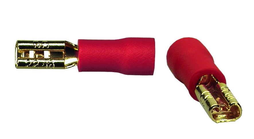 Позлатени и изолирани конектори за плоски входове на високоговорителите. За кабел с напречно сечение 0,75 - 1,5 mm², за faston 2,8 mm. Цветът на втулката е червен. В опаковката има 10 броя.За марката