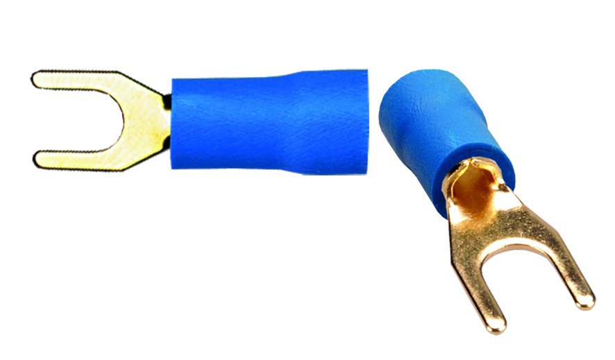 Позлатени и изолирани вилки. За кабел с напречно сечение 1,5 - 2,5 mm². Могат да се запоят или да се стегнат с клещи. В опаковката има 10 броя, синя втулка.
