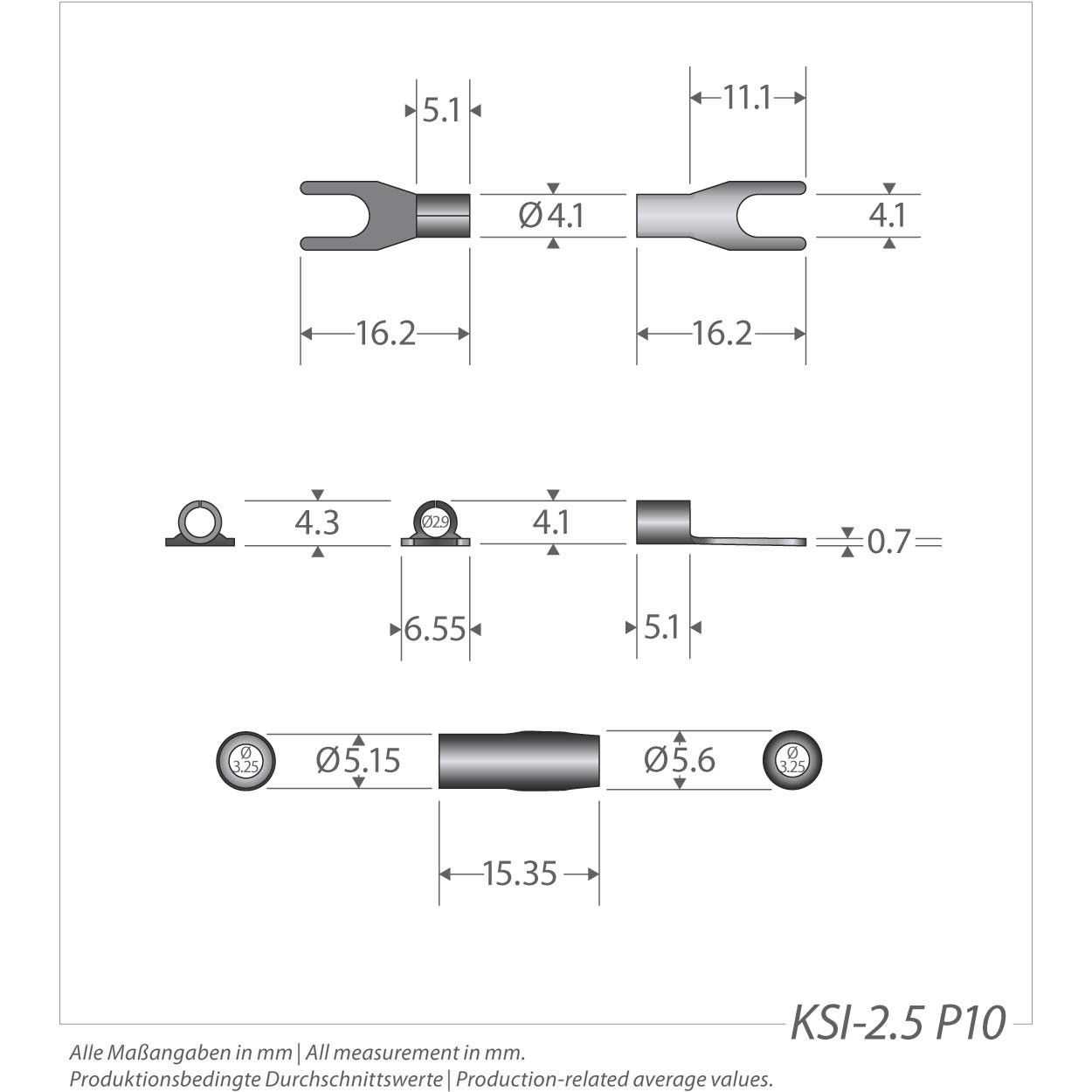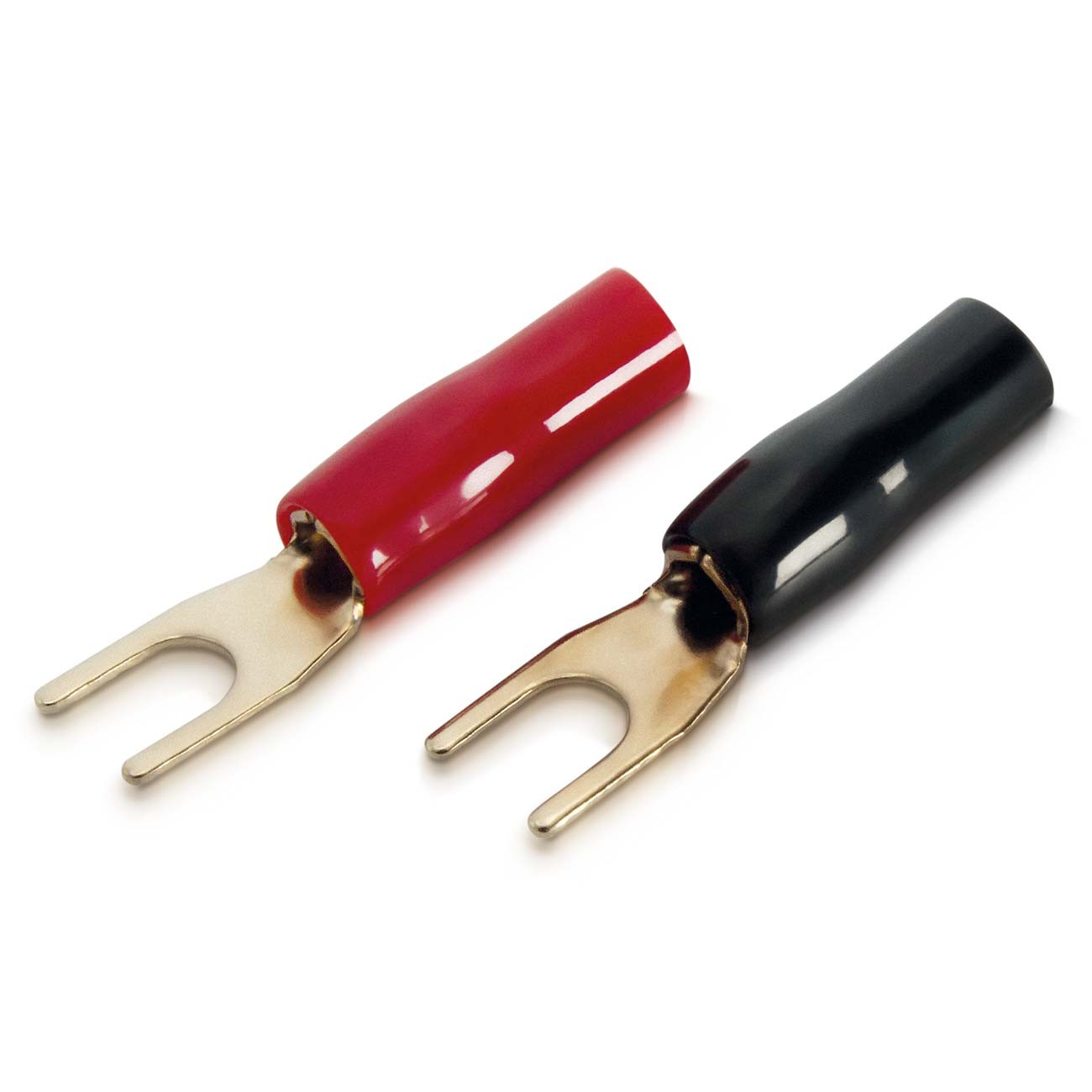 Вилични накрайници за кабел с напречно сечение 2,5 mm². В опаковката ще намерите 10 броя (5 червени, 5 черни изолационни втулки). Могат да се запояват или да се стиснат с клещи по класическия начин. Вътрешно разстояние на вилицата 4,15 мм, външно 6,15 мм.