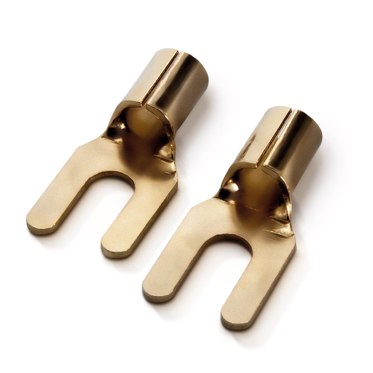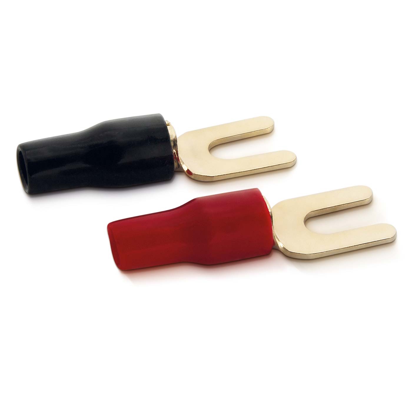 Кабелни вилички за кабел с сечение 4 mm². В опаковката ще намерите 10 броя (5 червени и 5 черни изолации). Могат да се запоят или класически да се стиснат с клещи. Вътрешното разстояние на виличката 3,85 mm, външно 9,05 mm.