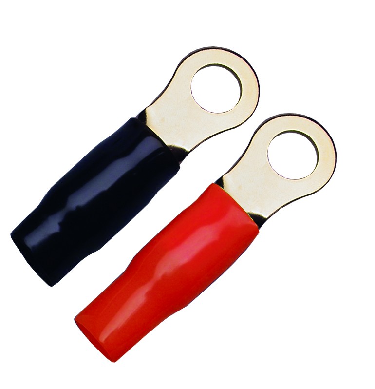 Позлатени пръстеновидни накрайници за кабел с напречно сечение 25 mm². Могат да се запояват или да се стиснат с клещи. Опаковката съдържа 2 броя (1x червена и 1x черна изолационна втулка). Вътрешният диаметър на пръстена е 12 мм, а външният диаметър е 19,8 мм.