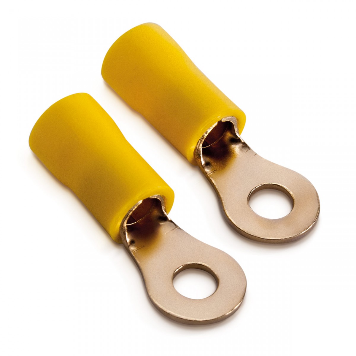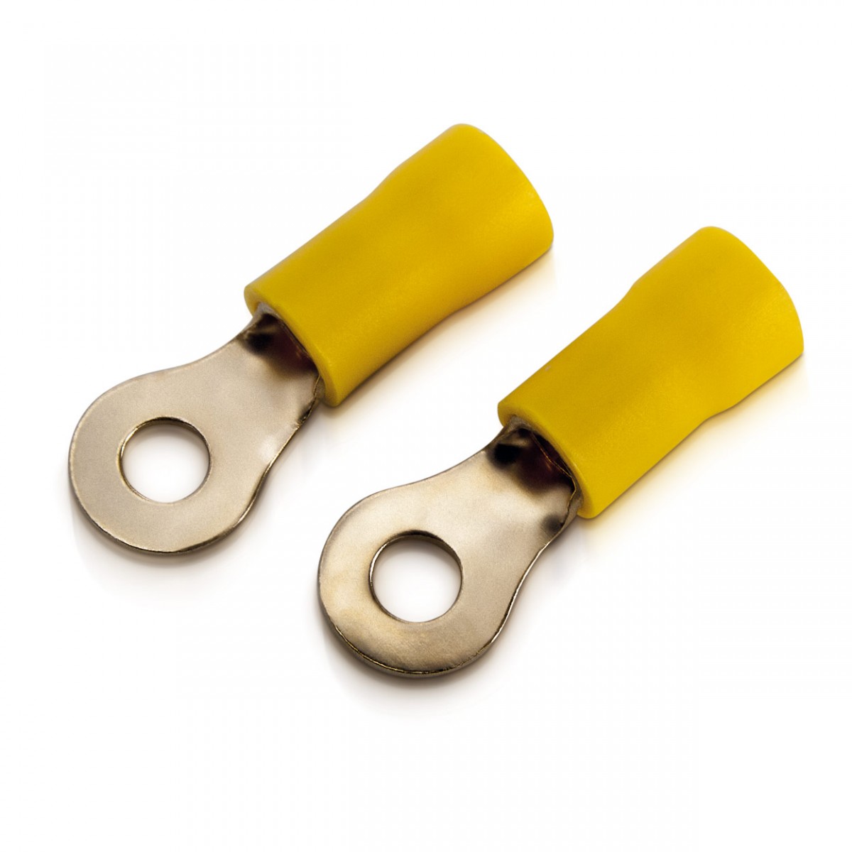 Позлатени пръстеновидни накрайници за кабел с напречно сечение 4,0 mm². Могат да се запояват или да се стиснат с клещи. Подходящи за проводници с напречно сечение от 2,5 mm² до 4,0 mm². Опаковката съдържа 10 броя (жълти изолационни втулки).