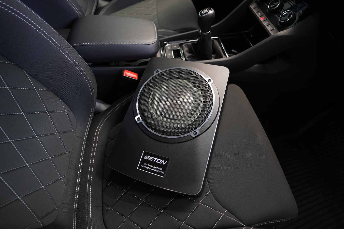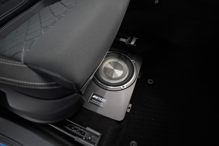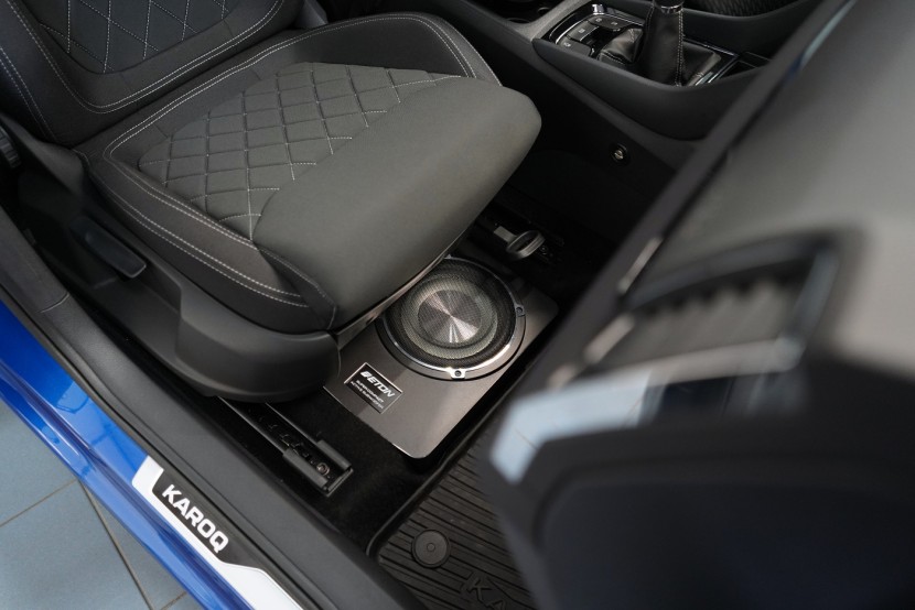 Новите автомобили Škoda Karoq и Kodiaq се отличават с много слаба басова компонентa на фабричната аудиосистема и затова често имаме заявка за усилване на динамиката на фабричното озвучаване. Идеалното решение е монтаж на активен субуфер под седалката на пътника. В момента най-често избираме плосък субуфер на немския производител Eton, който въпреки малките си размери може значително да подсили басовата част на звука и не заема място в интериора на автомобила, което често е изискване.