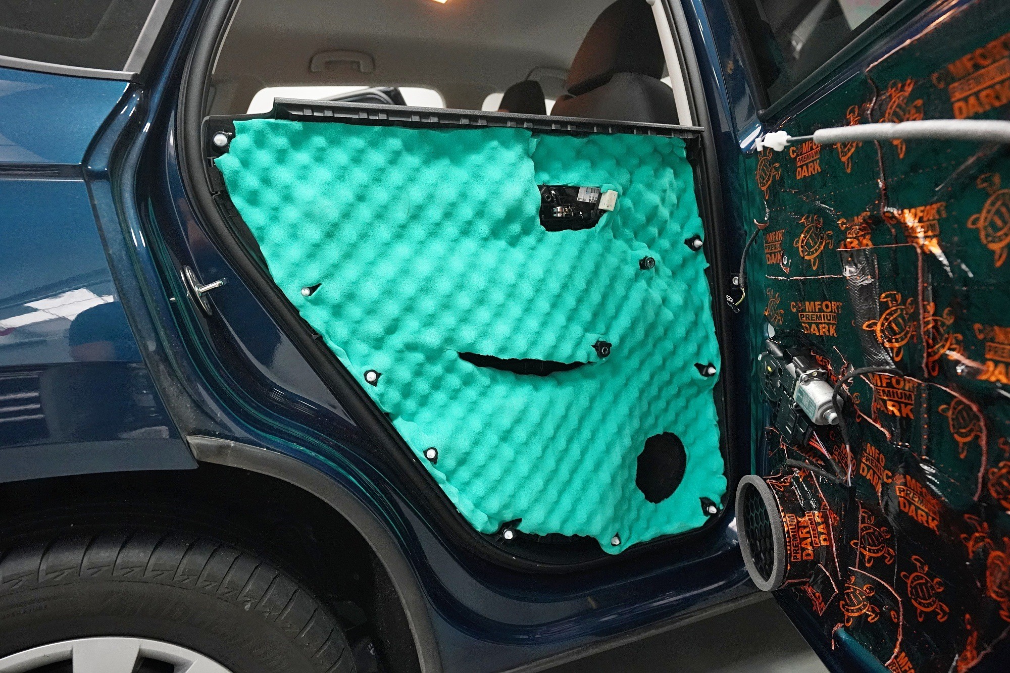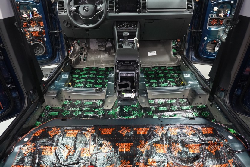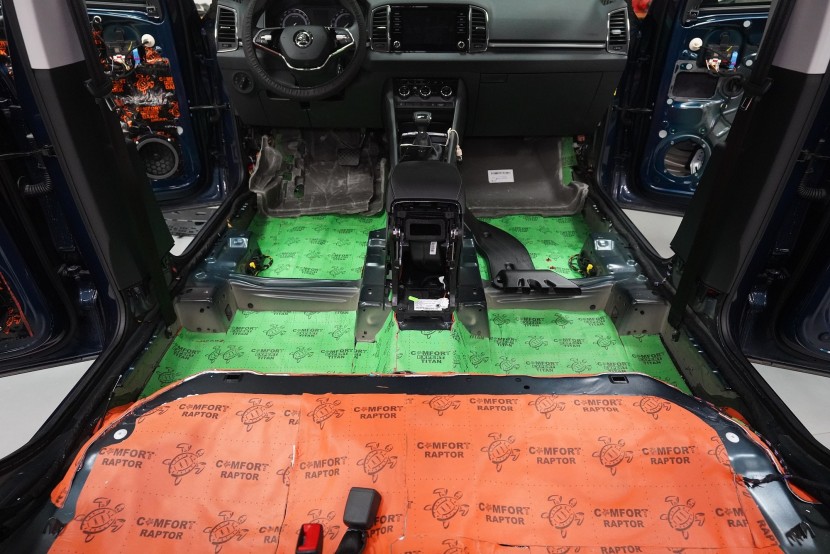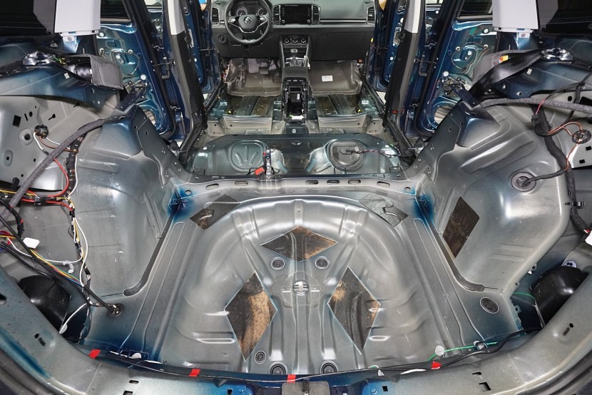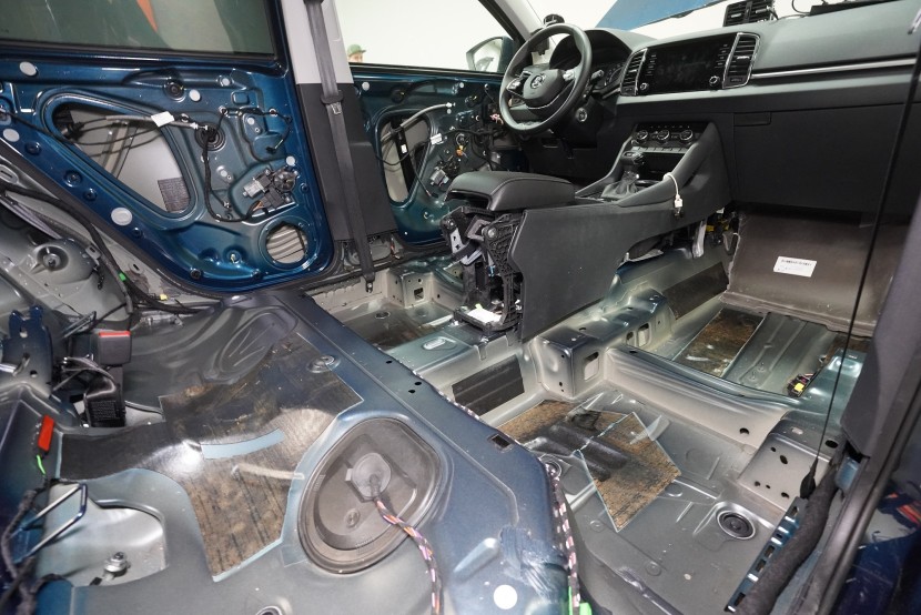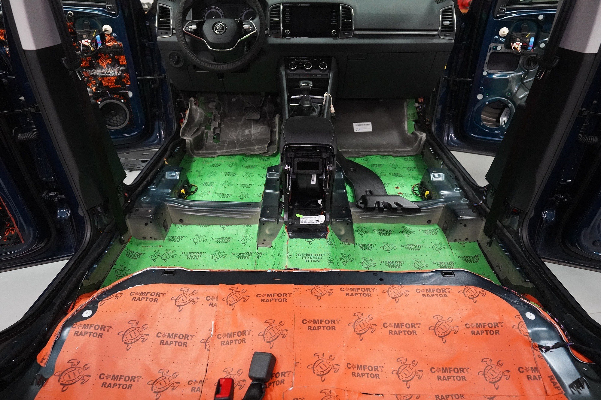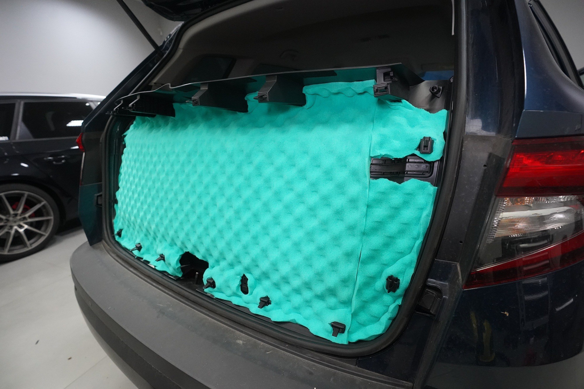 Шумоизолация на много популярен чешки SUV Škoda Karoq. Наследникът на Škoda Yeti се отличава с просторен и променлив интериор, качествена изработка, както и комфортно окачване и икономични двигатели. Ние обаче ще разгледаме заводската звукова изолация. И тук, за съжаление, отново преобладава разочарованието. Голи ламарини с минимална защита срещу вибрации и звукова изолация практически само под формата на гумено покритие в предната част на пода. С увеличаване на скоростта започва да се проявява шум от предните и задни гуми, шум от двигателя и трансмисията, както и околен пътен и аеродинамичен шум. Собственикът реши да сложи край на това състояние и се свърза с нас с молба за корекция. Съгласихме се на нашия пакет шумоизолация Premium Plus, който освен покрива включва всички важни области на автомобила. Конкретно шумоизолираме предни, задни и пета врата, пода, багажното отделение, задните арки и капака. В сравнение с класическия пакет Premium избираме по-ефективни и по-плътни материали и повече слоеве, със специално внимание към пода и задните арки на автомобила. Именно тези области са най-силно изложени на шум и е необходимо да се използват много ефективни материали. За шумоизолацията работят едновременно трима наши техници, които успяват да извършат монтажа в рамките на 1 работен ден.