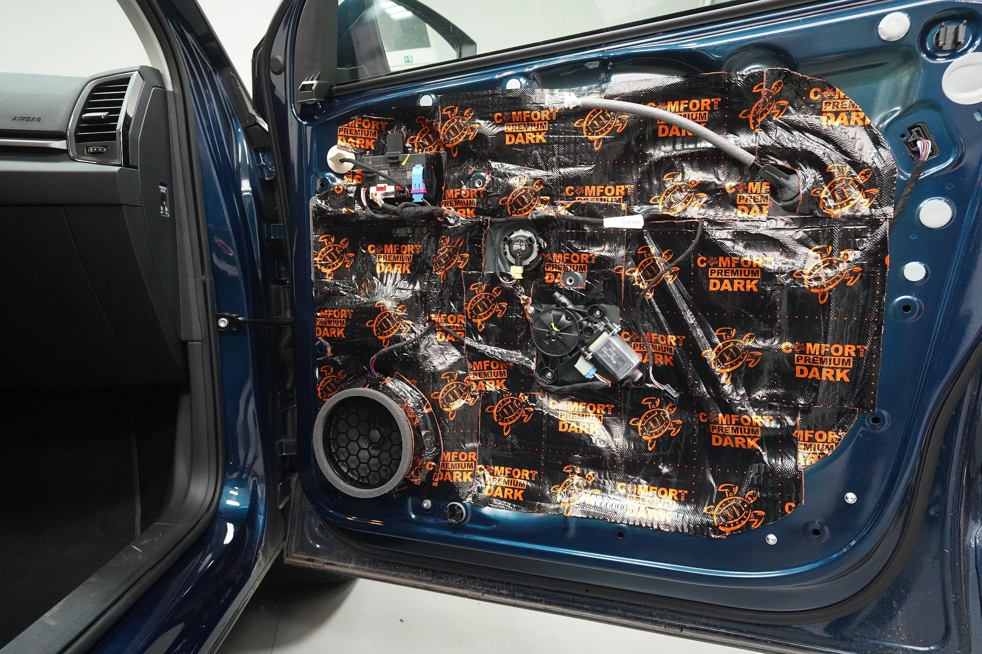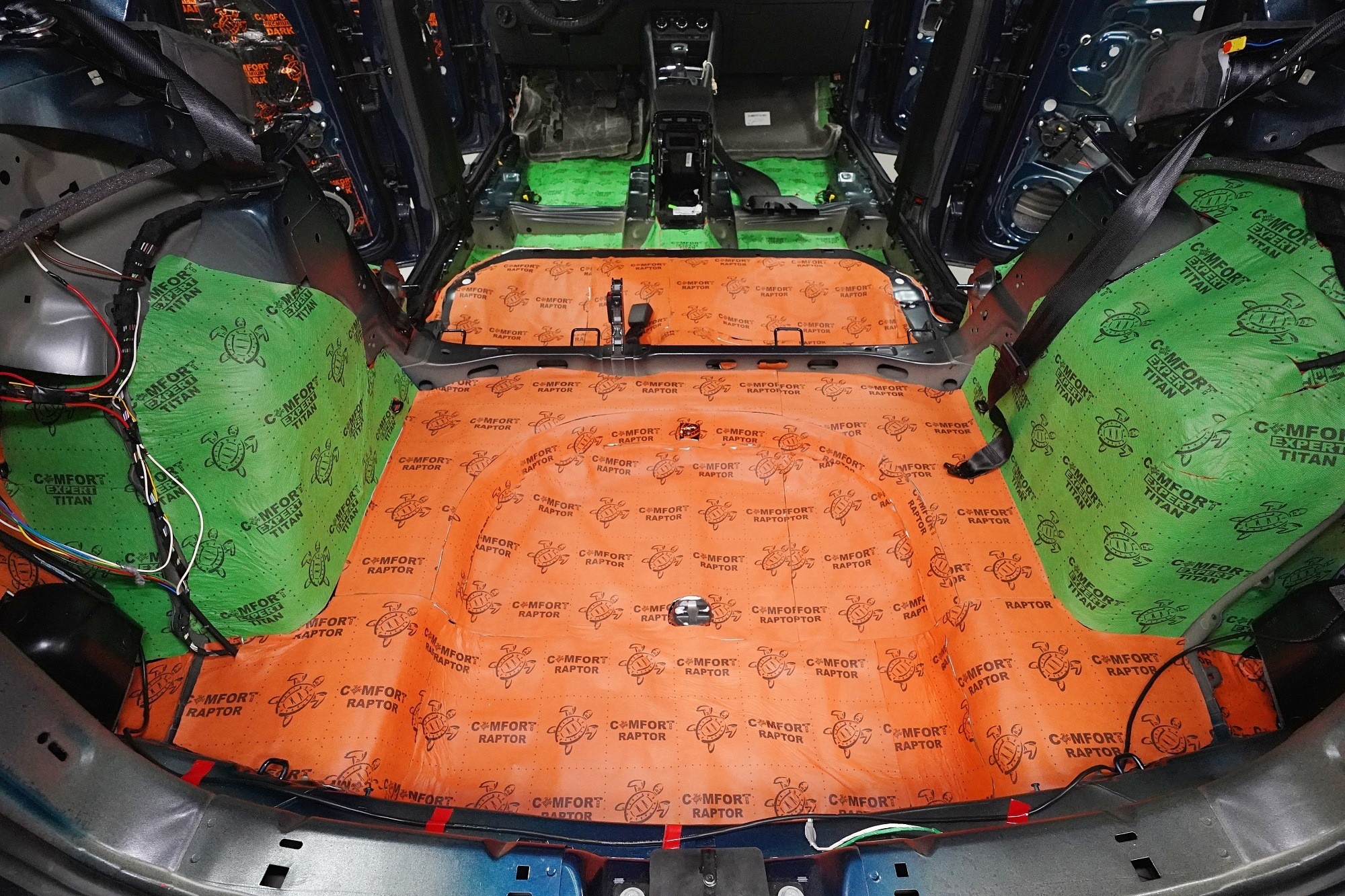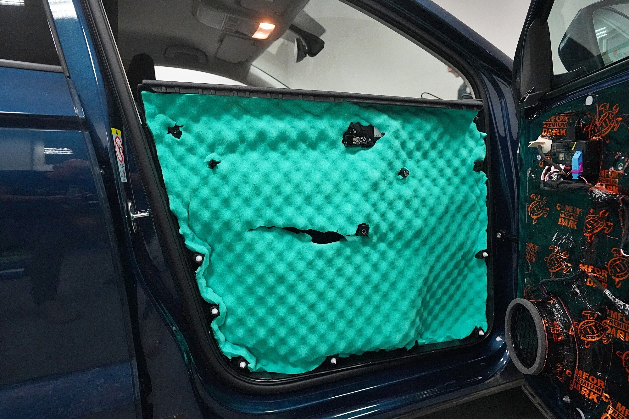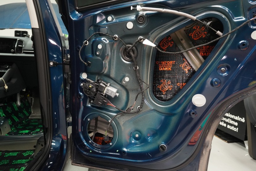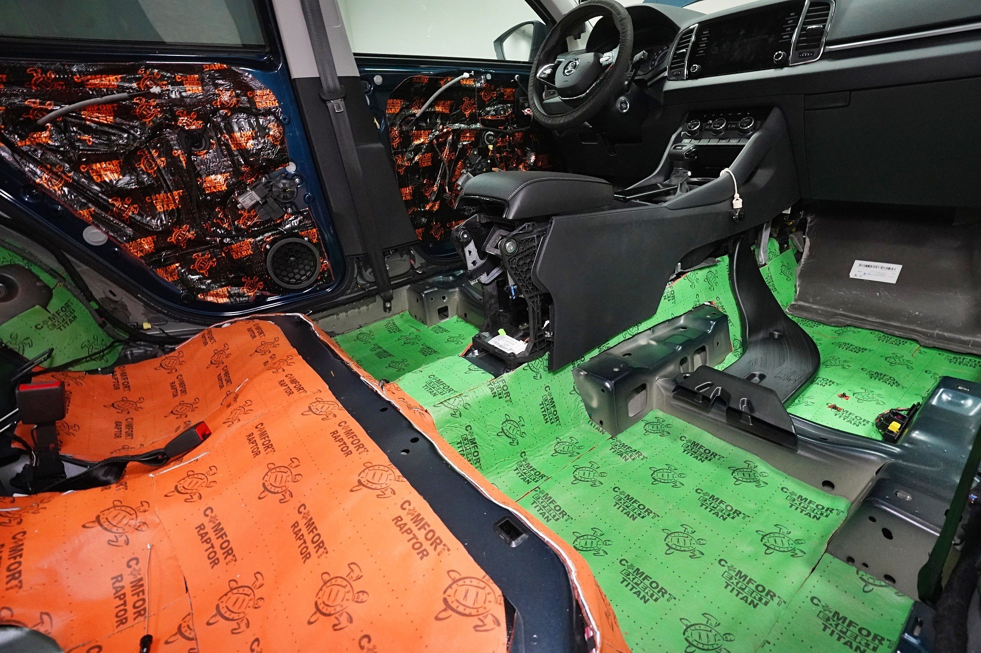 Шумоизолация на много популярен чешки SUV Škoda Karoq. Наследникът на Škoda Yeti се отличава с просторен и променлив интериор, качествена изработка, както и комфортно окачване и икономични двигатели. Ние обаче ще разгледаме заводската звукова изолация. И тук, за съжаление, отново преобладава разочарованието. Голи ламарини с минимална защита срещу вибрации и звукова изолация практически само под формата на гумено покритие в предната част на пода. С увеличаване на скоростта започва да се проявява шум от предните и задни гуми, шум от двигателя и трансмисията, както и околен пътен и аеродинамичен шум. Собственикът реши да сложи край на това състояние и се свърза с нас с молба за корекция. Съгласихме се на нашия пакет шумоизолация Premium Plus, който освен покрива включва всички важни области на автомобила. Конкретно шумоизолираме предни, задни и пета врата, пода, багажното отделение, задните арки и капака. В сравнение с класическия пакет Premium избираме по-ефективни и по-плътни материали и повече слоеве, със специално внимание към пода и задните арки на автомобила. Именно тези области са най-силно изложени на шум и е необходимо да се използват много ефективни материали. За шумоизолацията работят едновременно трима наши техници, които успяват да извършат монтажа в рамките на 1 работен ден.