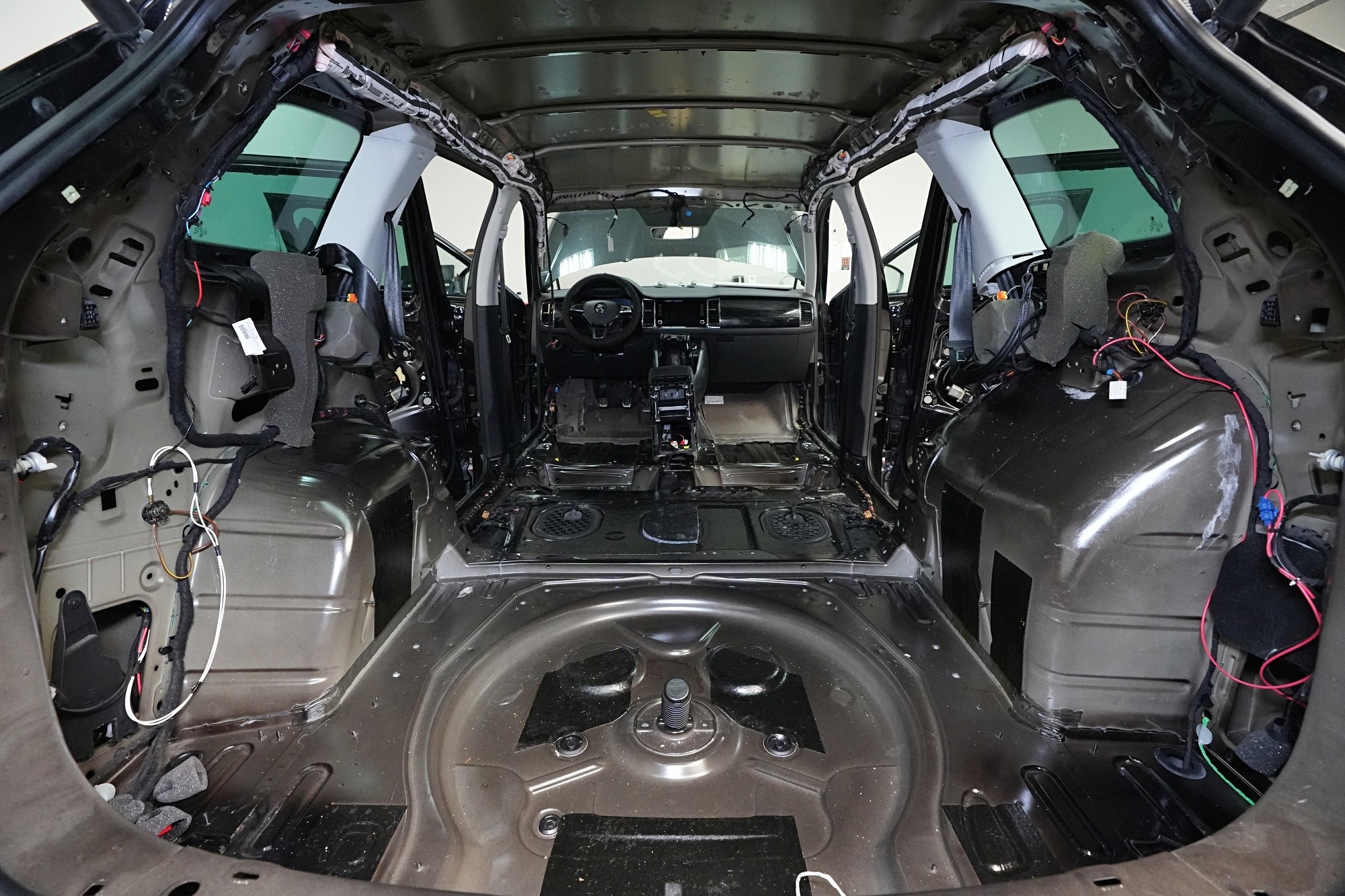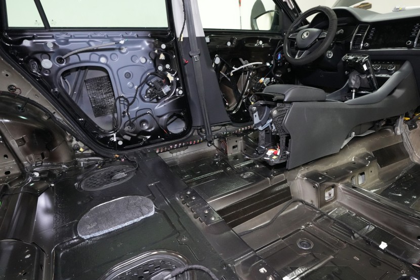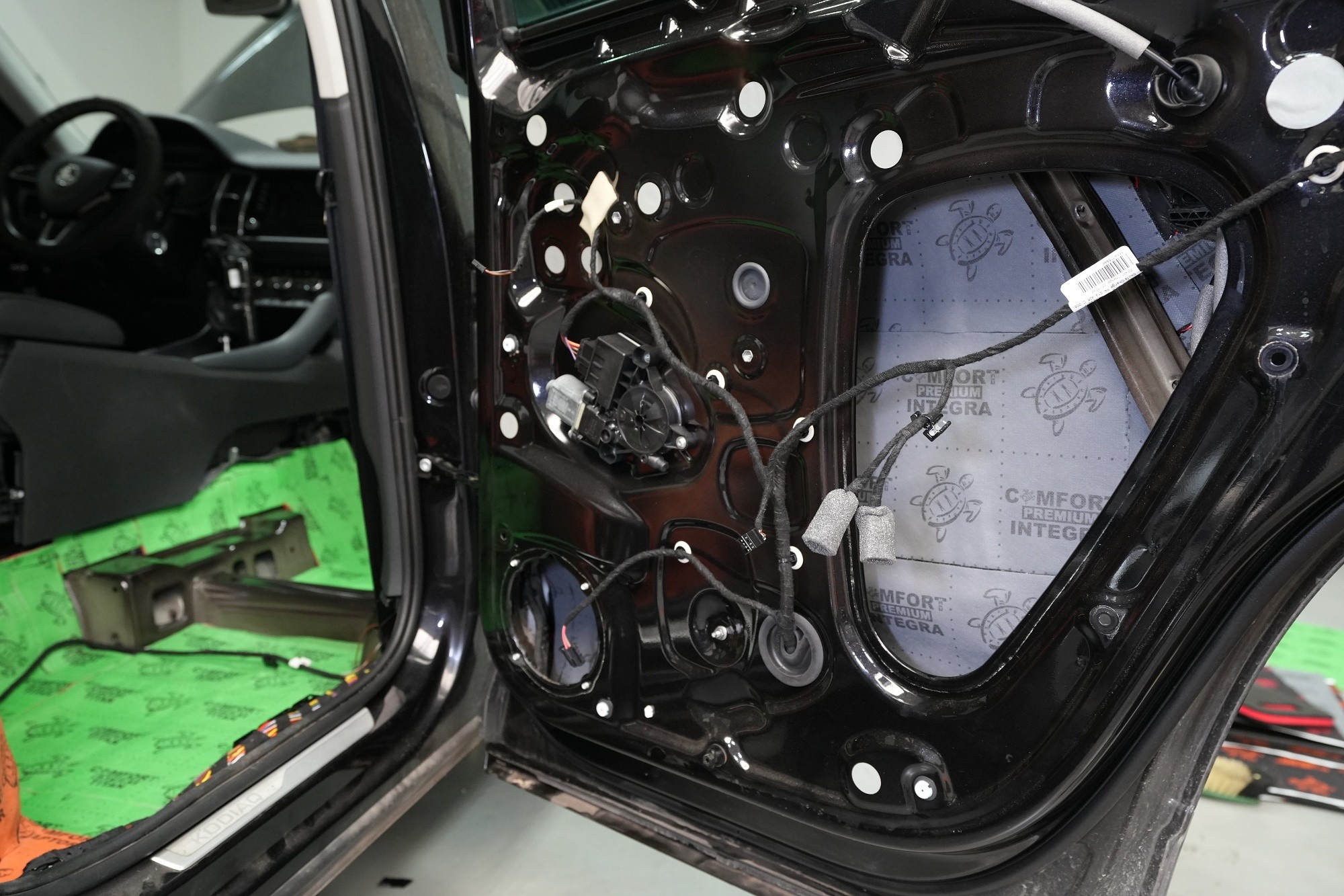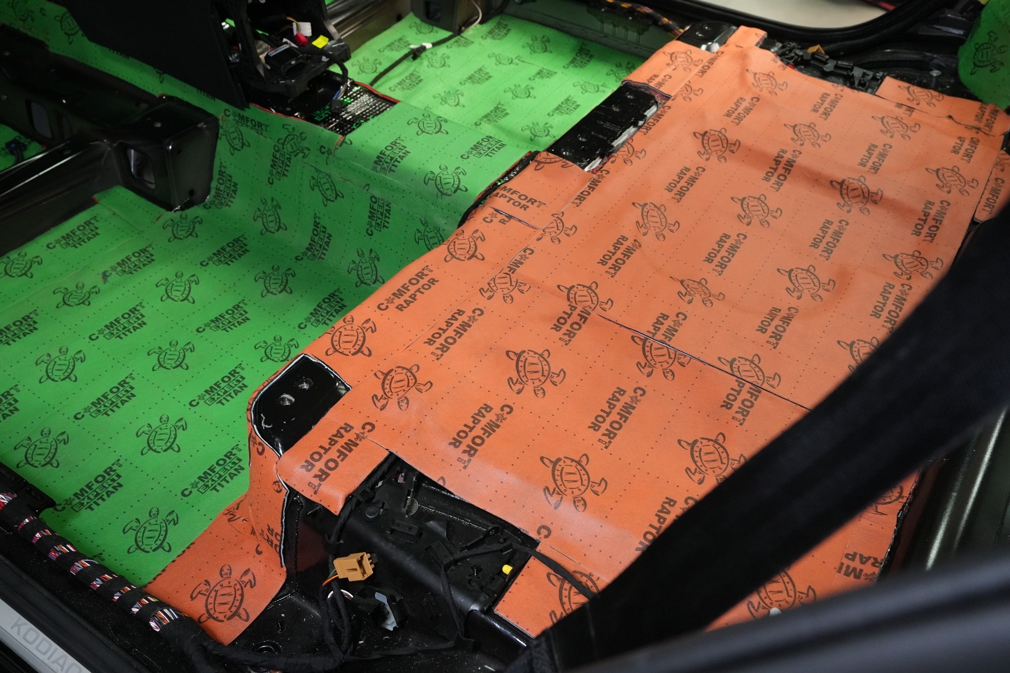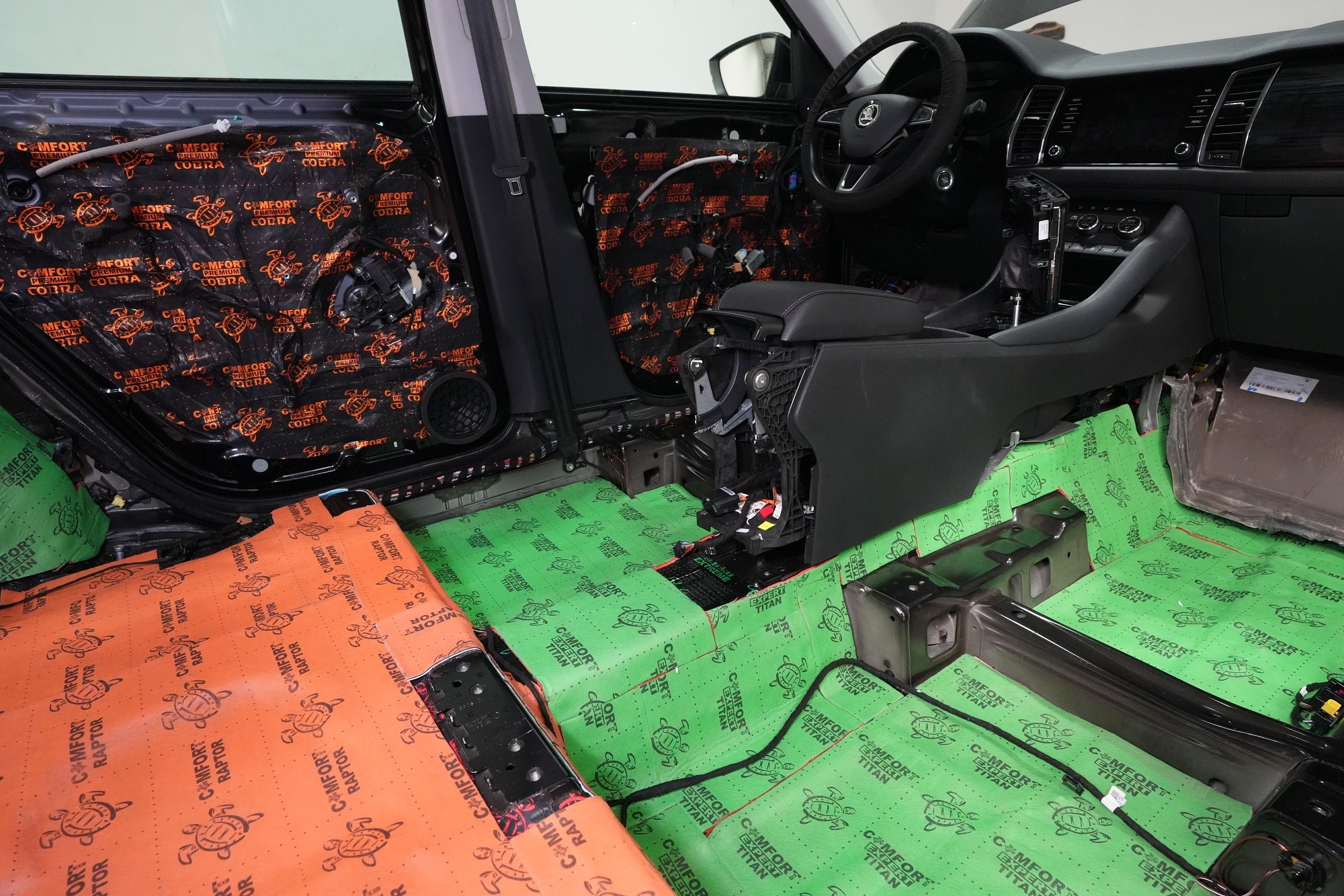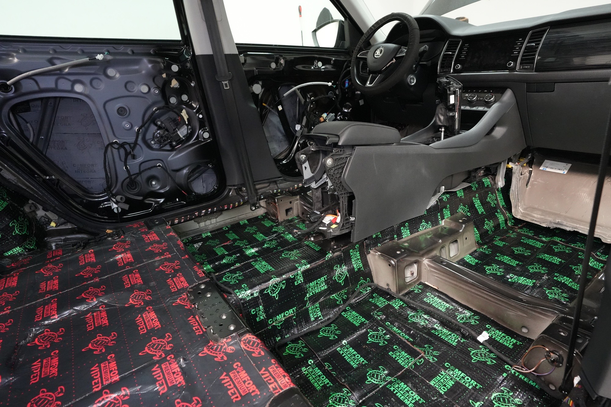 Шумоизолация на автомобила Škoda Kodiaq в рамките на нашия най-ефективен пакет за шумоизолация Expert Plus. Инсталация на шумоизолация за Škoda Kodiaq вече сме публикували на уебсайта многократно, но този път включва всички най-нови премиум материали Comfortmat и решихме да ги покажем всички. Задачата от нашия клиент беше ясна — максимално обезшумяване на автомобила и премахване на всички източници на вибрации и шум. С собственика се договорихме за нашия най-ефективен пакет за шумоизолация Expert Plus. В сравнение с класическия пакет Expert избираме по-ефективни и по-дебели материали и повече слоеве, съсредоточени предимно върху пода и задните калници на автомобила. Конкретно шумоизолираме предните, задните и петите врати, пода, багажното отделение, предните и задните вътрешни калници, покрива, таблото и капака. Всички важни зони на автомобила са шумоизолирани с модерни двуслойни материали и в резултат са приложени четири слоя шумоизолация с различни свойства. На шумоизолацията работят едновременно четирима наши техници, които успяват да монтират през 1 работен ден. Повече информация ще намерите в нашия подробен фоторепортаж.