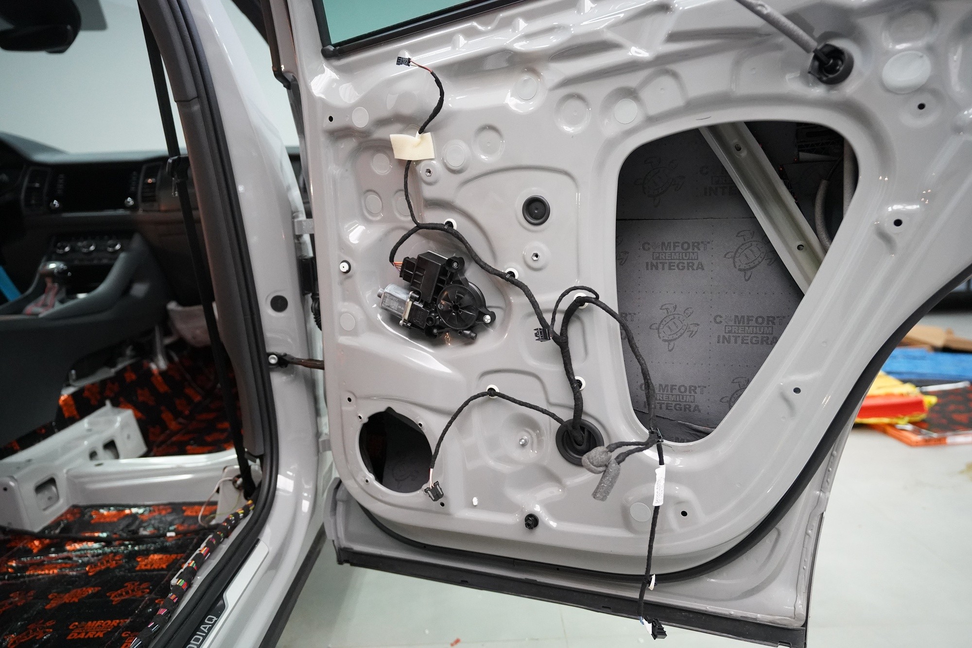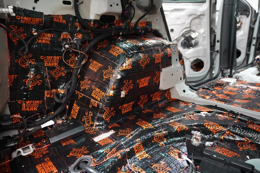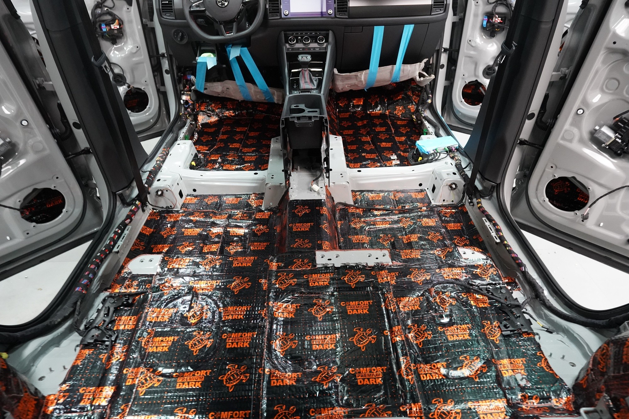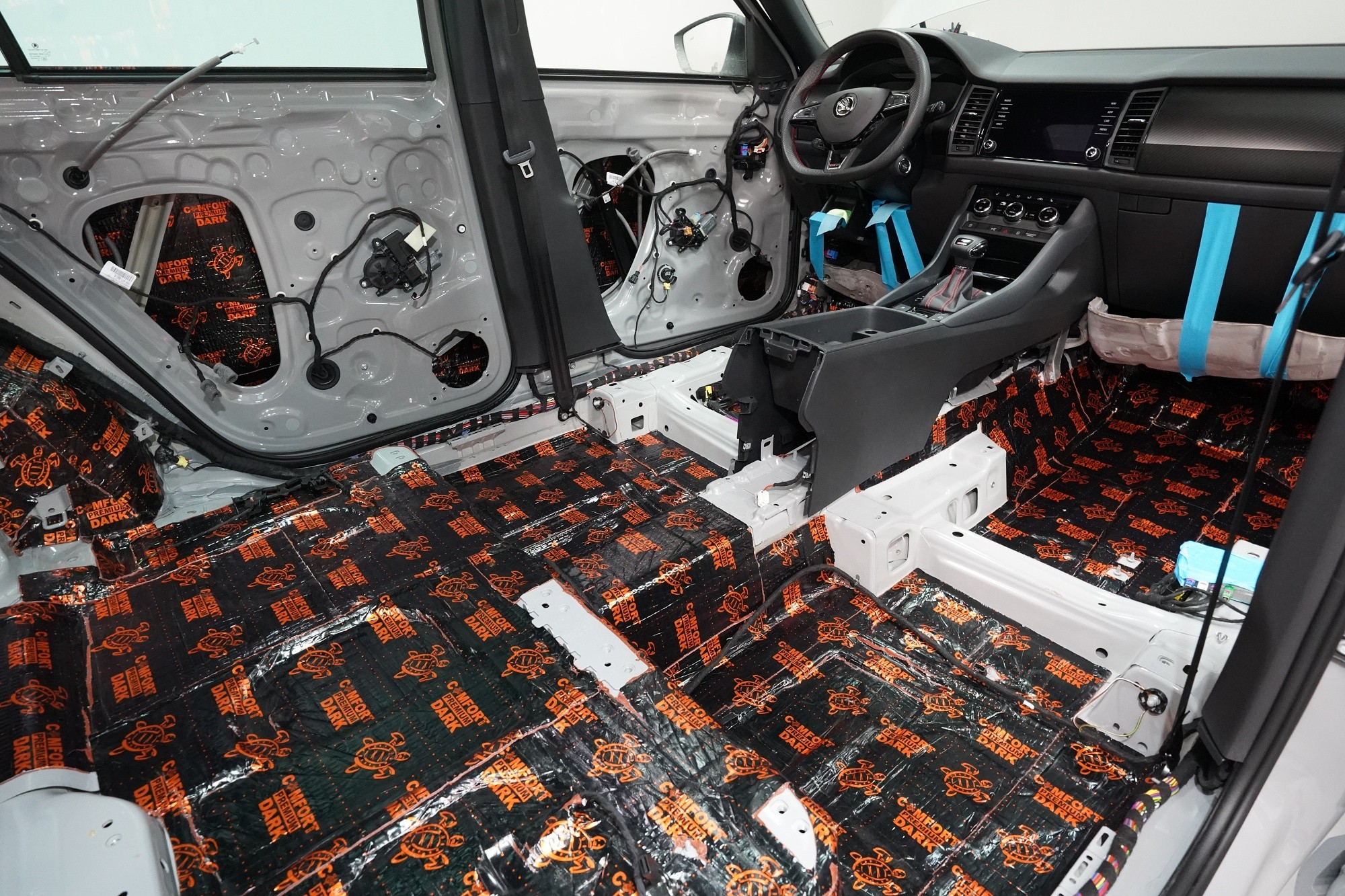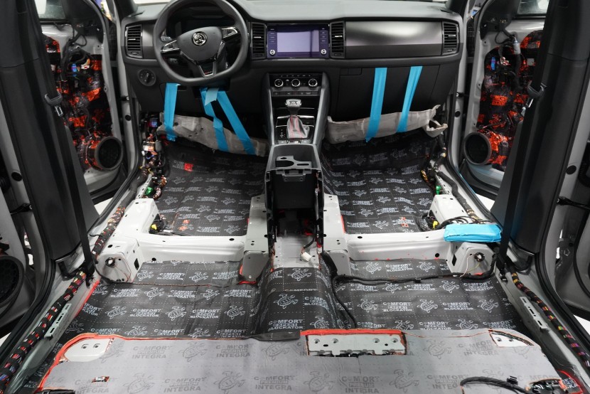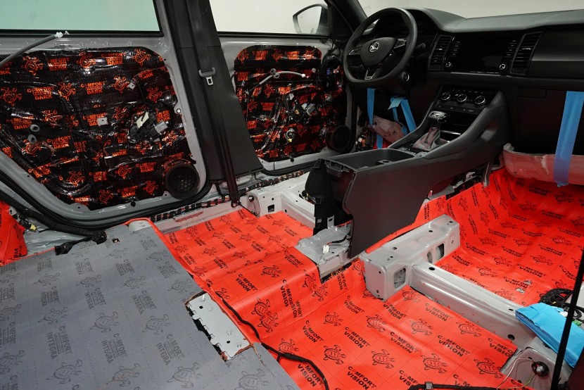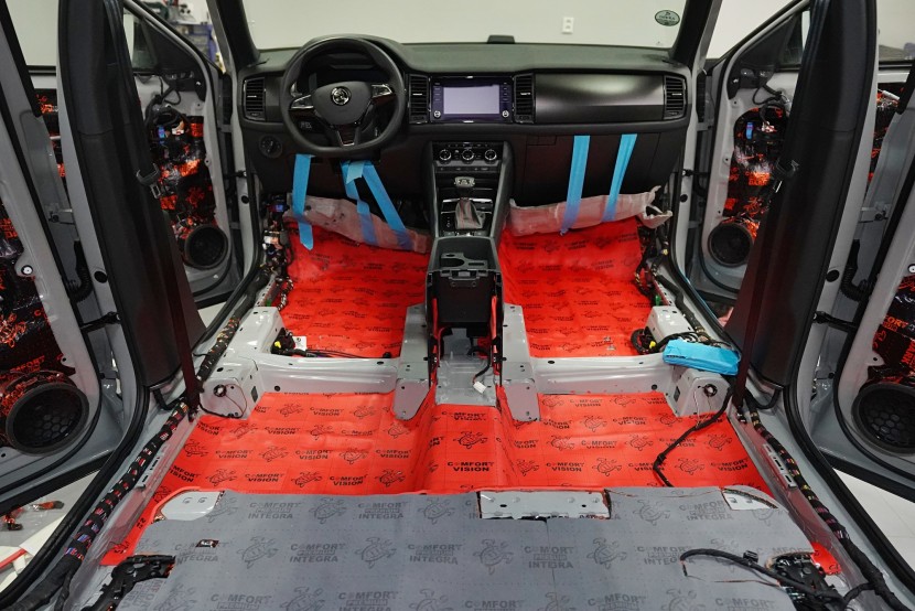 Звукоизолация на автомобил Škoda Kodiaq RS. Популярният чешки SUV е флагманът на Škoda, но фабричната звукова изолация за съжаление далеч не отговаря на това. С увеличаване на скоростта в кабината бързо нараства интензитетът на шума, и то основно от двигателя, скоростната кутия, през пода от пътя и вероятно най-силно традиционно от предните и задните колела. Нашата задача е да направим от тази красавица качествено различен автомобил по отношение на шумоизолация, така че собственика да може да се наслаждава на по-тихо и по-комфортно пътуване. Съгласихме се със собственика на пакет шумоизолация Premium Plus. В сравнение с класическия пакет Premium избираме по-ефективни и по-дебели материали и повече слоеве, като се фокусираме основно върху пода и задните калници на автомобила. Конкретно шумоизираме предни, задни и пета врата, пода, багажното пространство, задните калници и капака. Извън пакета шумоизолирахме и таблото за намаляване на шума от двигателя. Тъй като всички материали Comfortmat са и термоизолационни, този автомобил вече е защитен от топлинни загуби и термоизолационните свойства ще оцените не само през зимата, но и през лятото. По шумоизолацията работят едновременно трима наши техници, които могат да монтират в рамките на 1 работен ден.